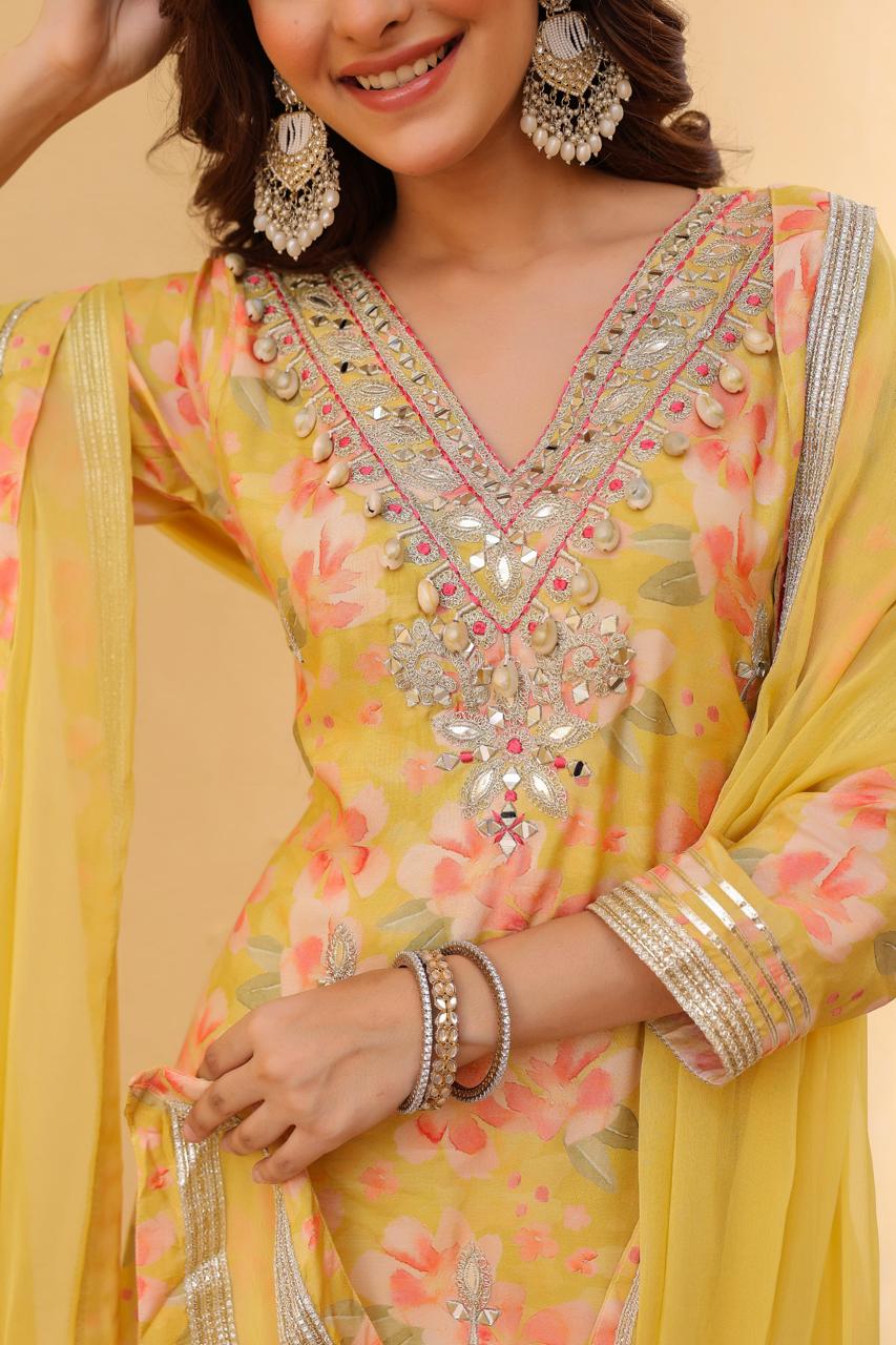 Brighten up your festive wardrobe with this radiant yellow floral printed suit set.