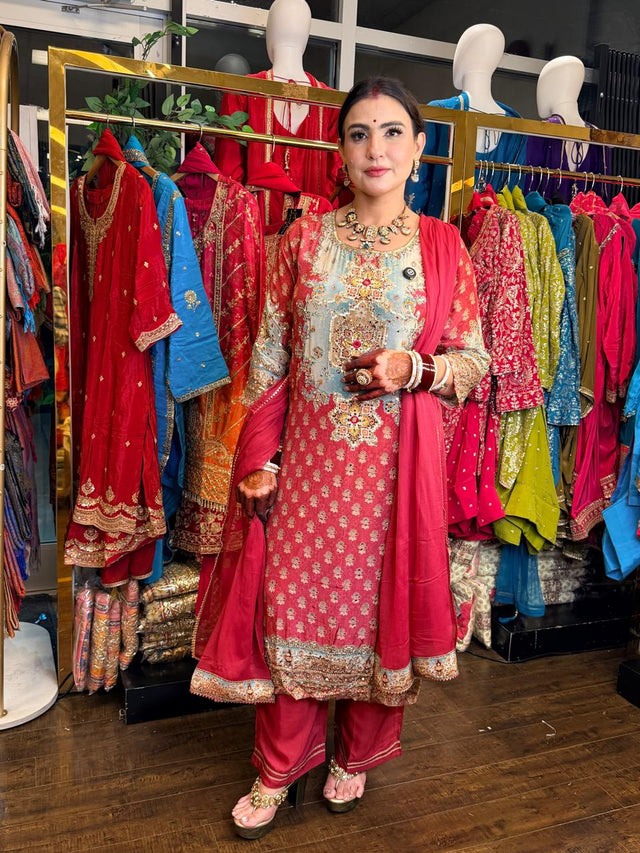 A regal navy blue and cream  ethnic ensemble with exquisite embroidery and floral detailing. The outfit combines rich fabric, intricate work, and a traditional silhouette, making it a statement piece for weddings, festive occasions, and formal gatherings.