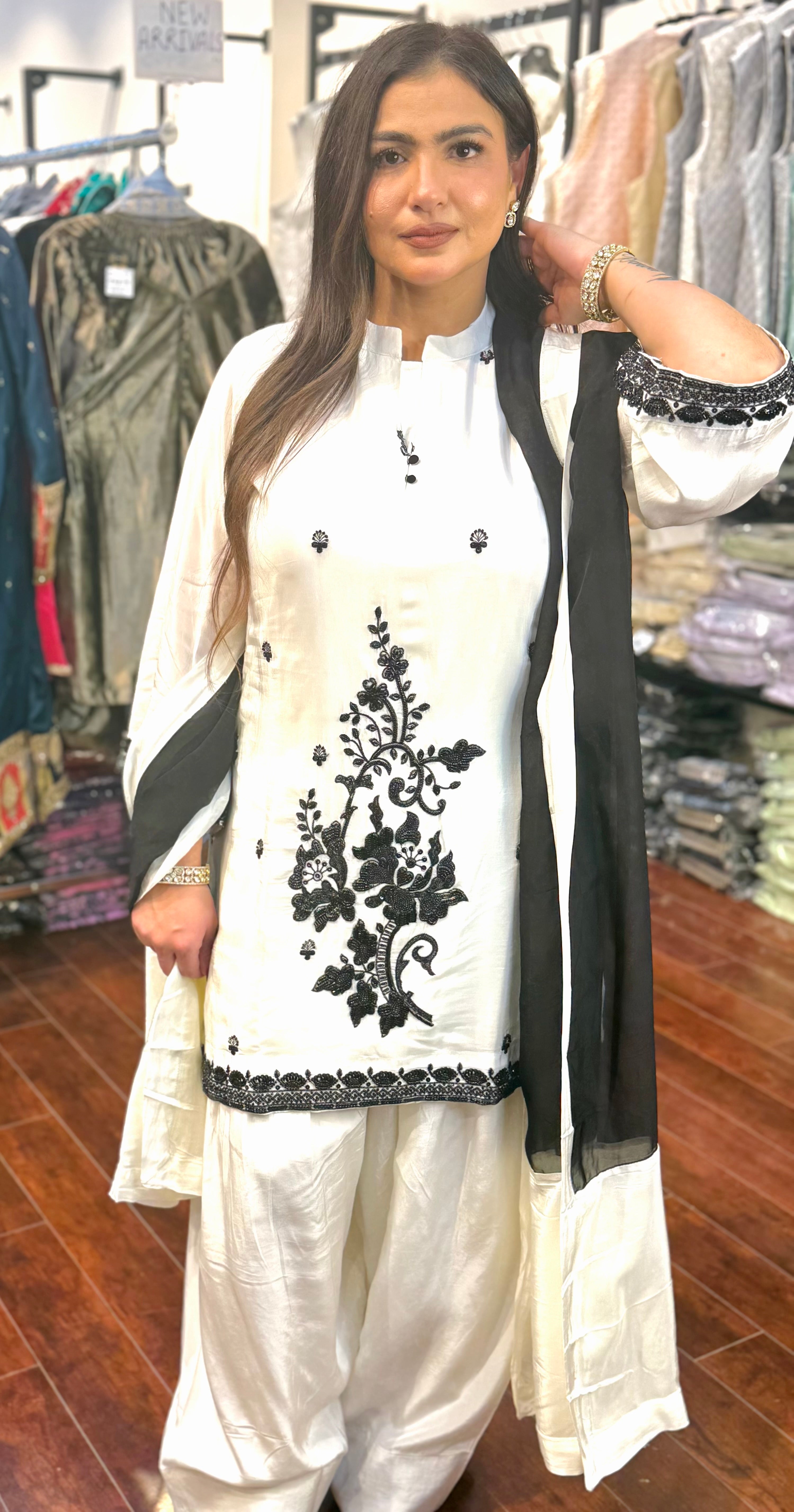 Embrace effortless sophistication with this elegant white and black suit set, crafted for modern women who love timeless ethnic fashion. The kurta features exquisite black floral embroidery on a pristine white base, giving it a striking monochrome appeal. The minimal black thread motifs and button detailing on the neckline add to its graceful design.
