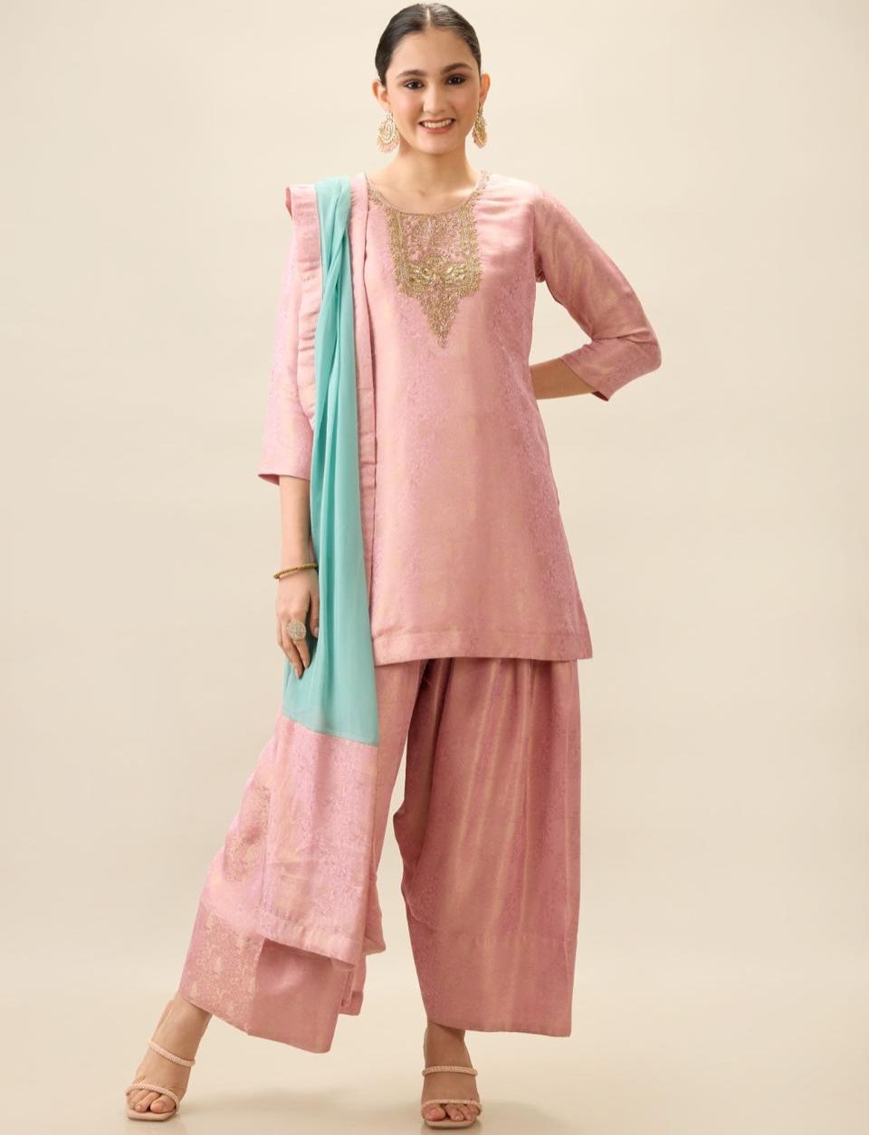 Step into timeless elegance with this exquisite pink silk kurta set, designed for a sophisticated and graceful look. The outfit features a straight-cut kurta with intricate golden embroidery on the neckline and front panel, adding a subtle touch of luxury. The soft sheen of the silk fabric enhances its festive and formal appeal.