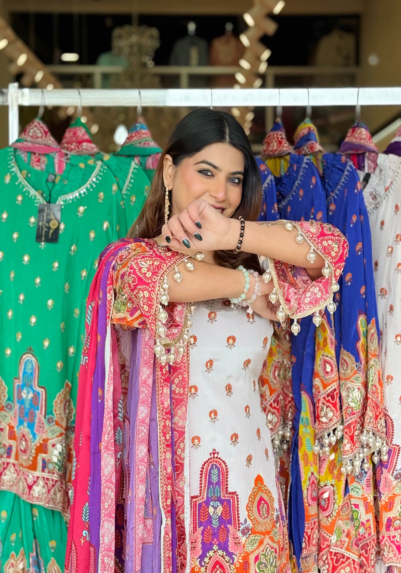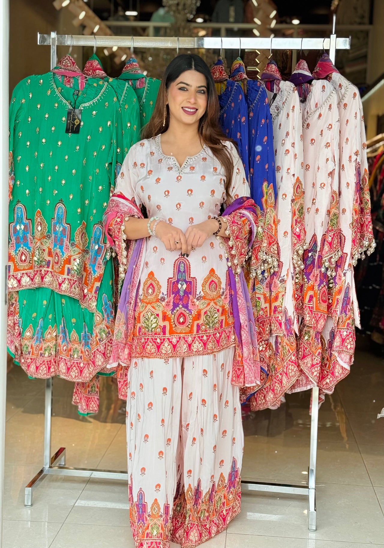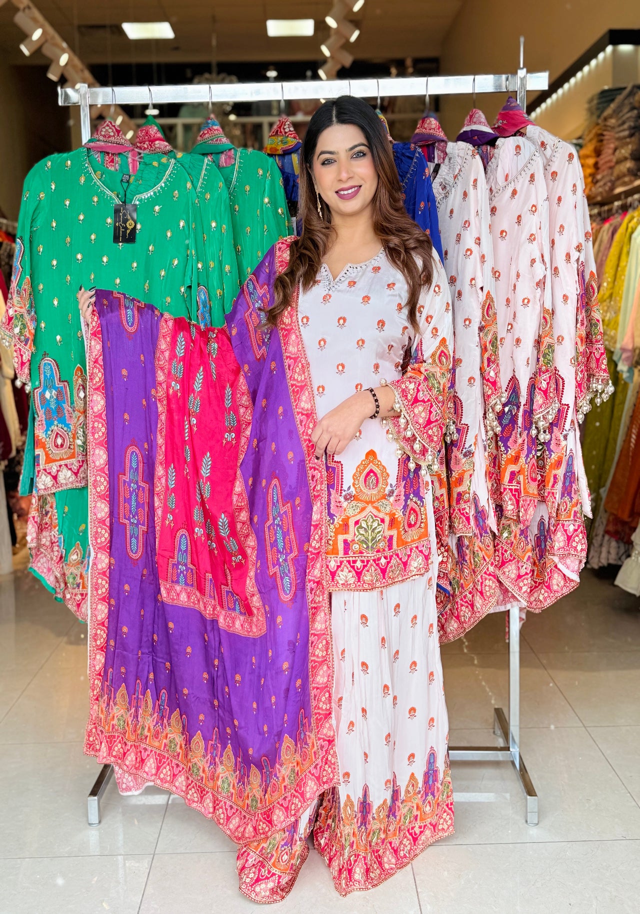 A stunning traditional ensemble that beautifully combines elegance with vibrant charm. This green sharara suit set features exquisite multicolored embroidery and a contrasting pink dupatta, creating a festive yet sophisticated look. Perfect for wedding functions, festive gatherings, and cultural celebrations.