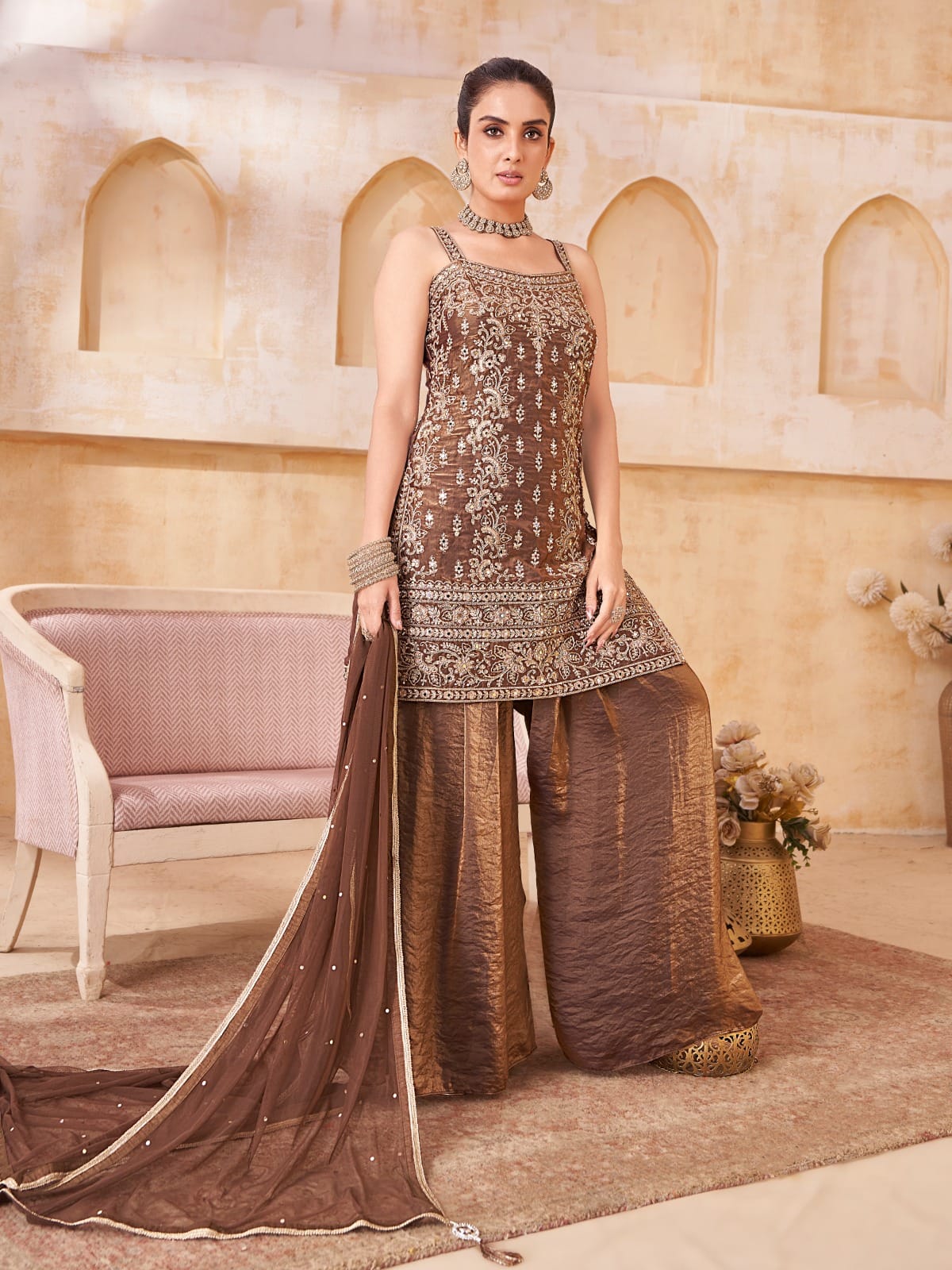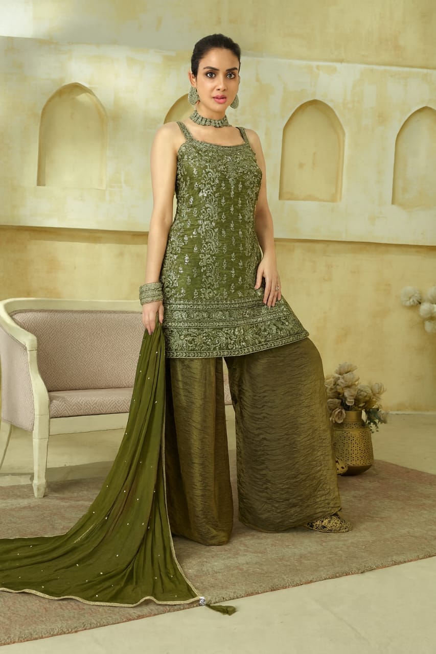 Dazzle in sophistication with this exquisite embroidered sharara set that radiates luxury and elegance. The sleeveless strap kurti is adorned with intricate zari and sequin embroidery, giving it a regal look perfect for festive occasions and weddings. Paired with a rich silk-textured sharara pant and a delicately embellished dupatta, this ensemble offers a modern yet traditional appeal. The subtle shimmer and flowy silhouette make it a timeless addition to your ethnic collection.