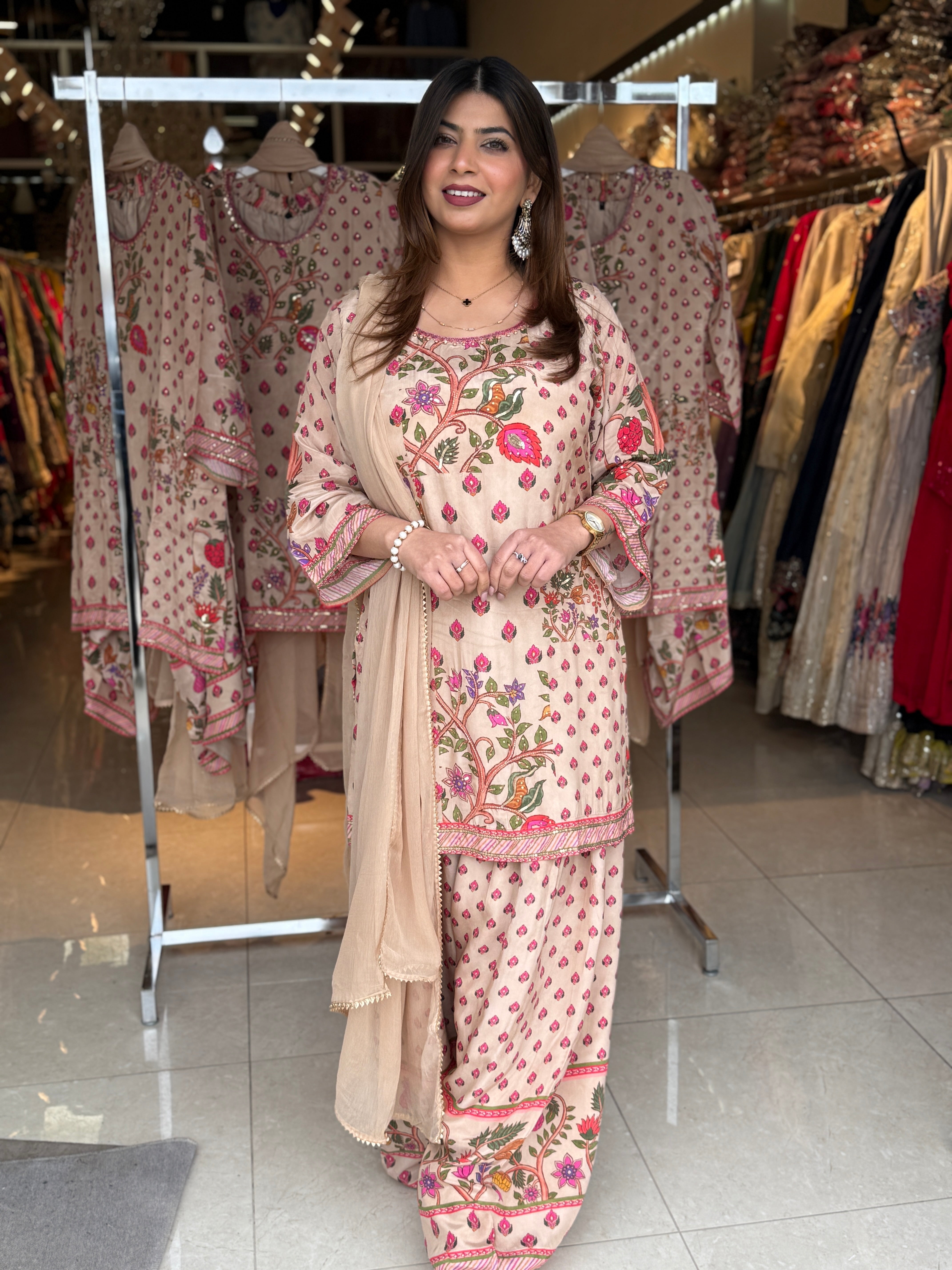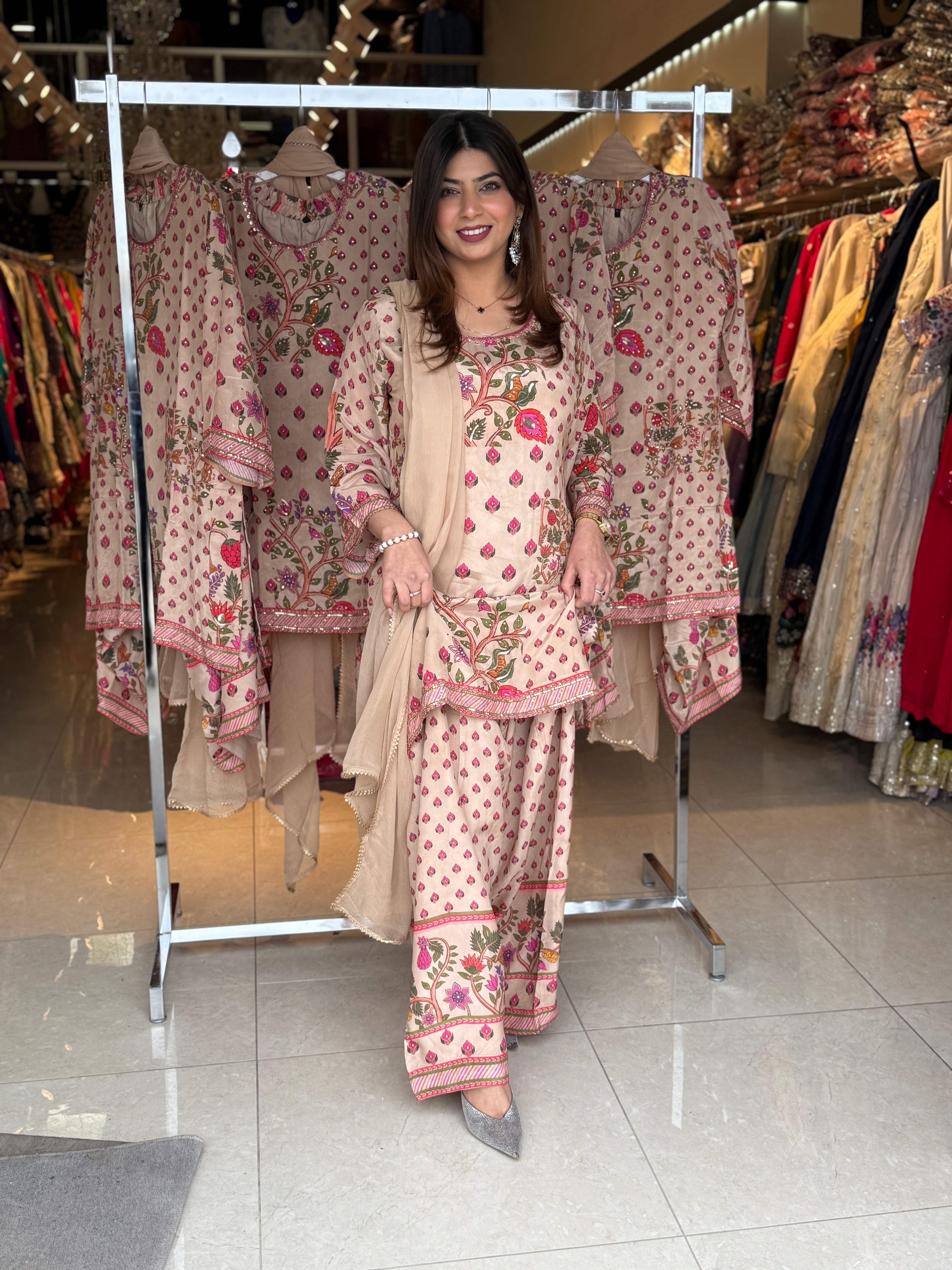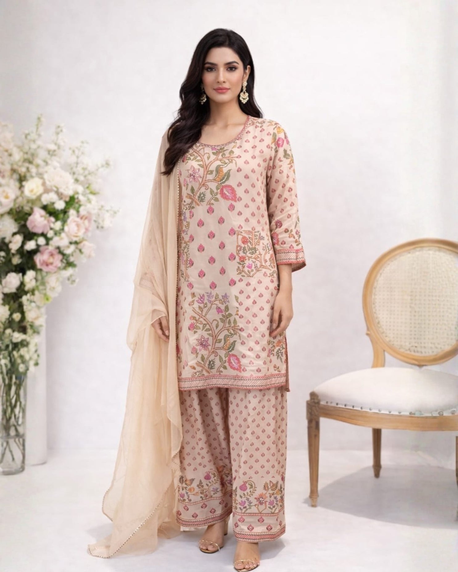Add timeless elegance to your ethnic wardrobe with this beautiful Farshi Salwar Suit, crafted in soft and breathable cotton fabric for all-day comfort. Designed with graceful floral prints and delicate detailing, this outfit offers a sophisticated ethnic look, perfect for festive gatherings, casual outings, and special occasions.