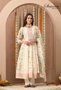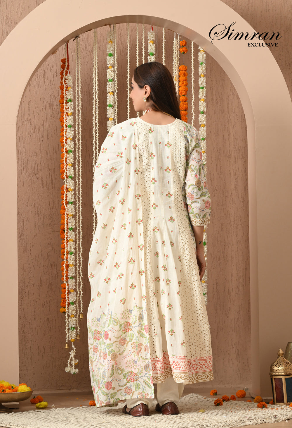 Step into timeless elegance with this ivory floral Anarkali suit, an exquisite blend of subtle charm and artisanal finesse. The soft ivory base is adorned with delicate thread embroidery and eyelet cutwork, creating a graceful, breezy silhouette perfect for festive mornings and day functions.