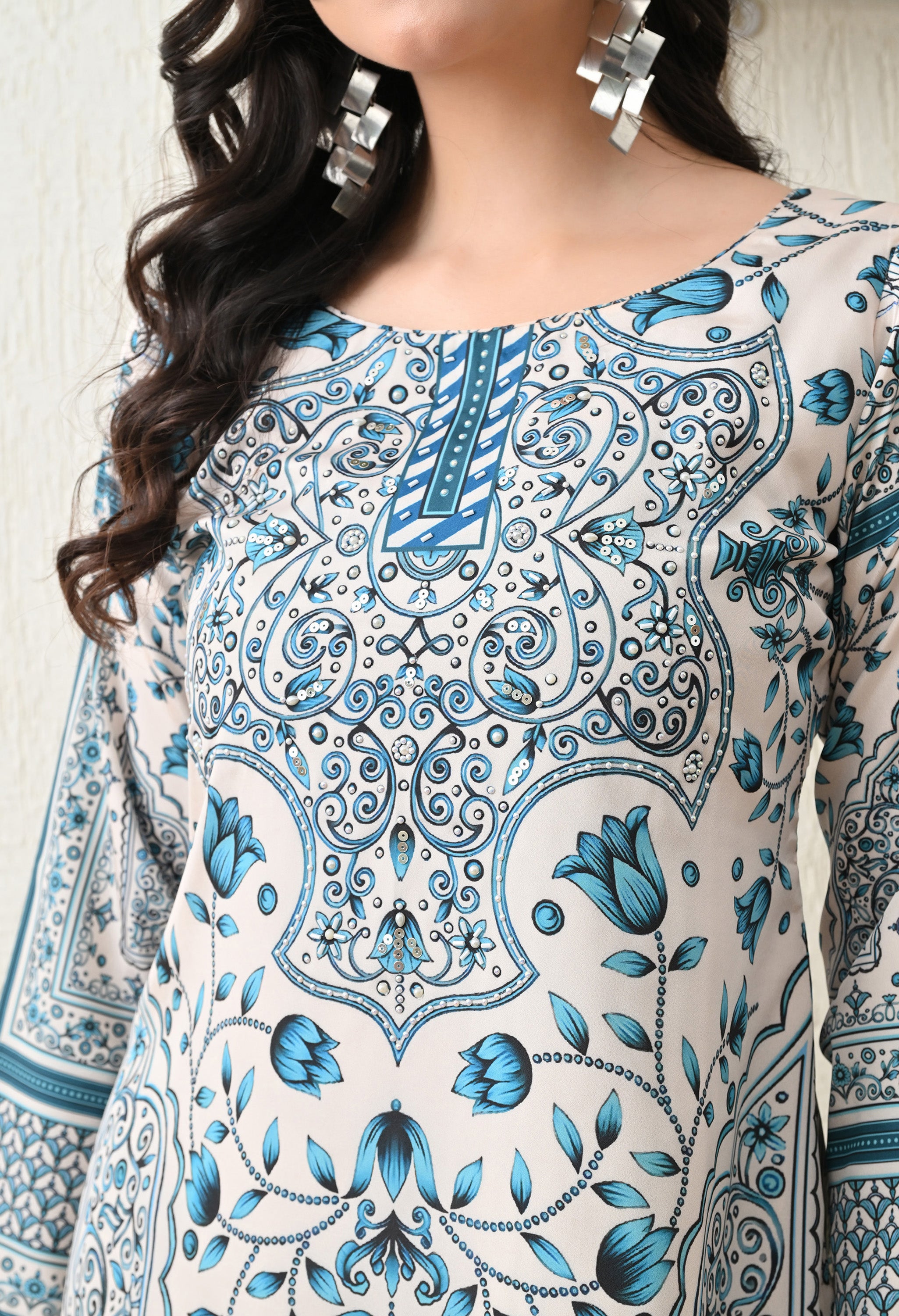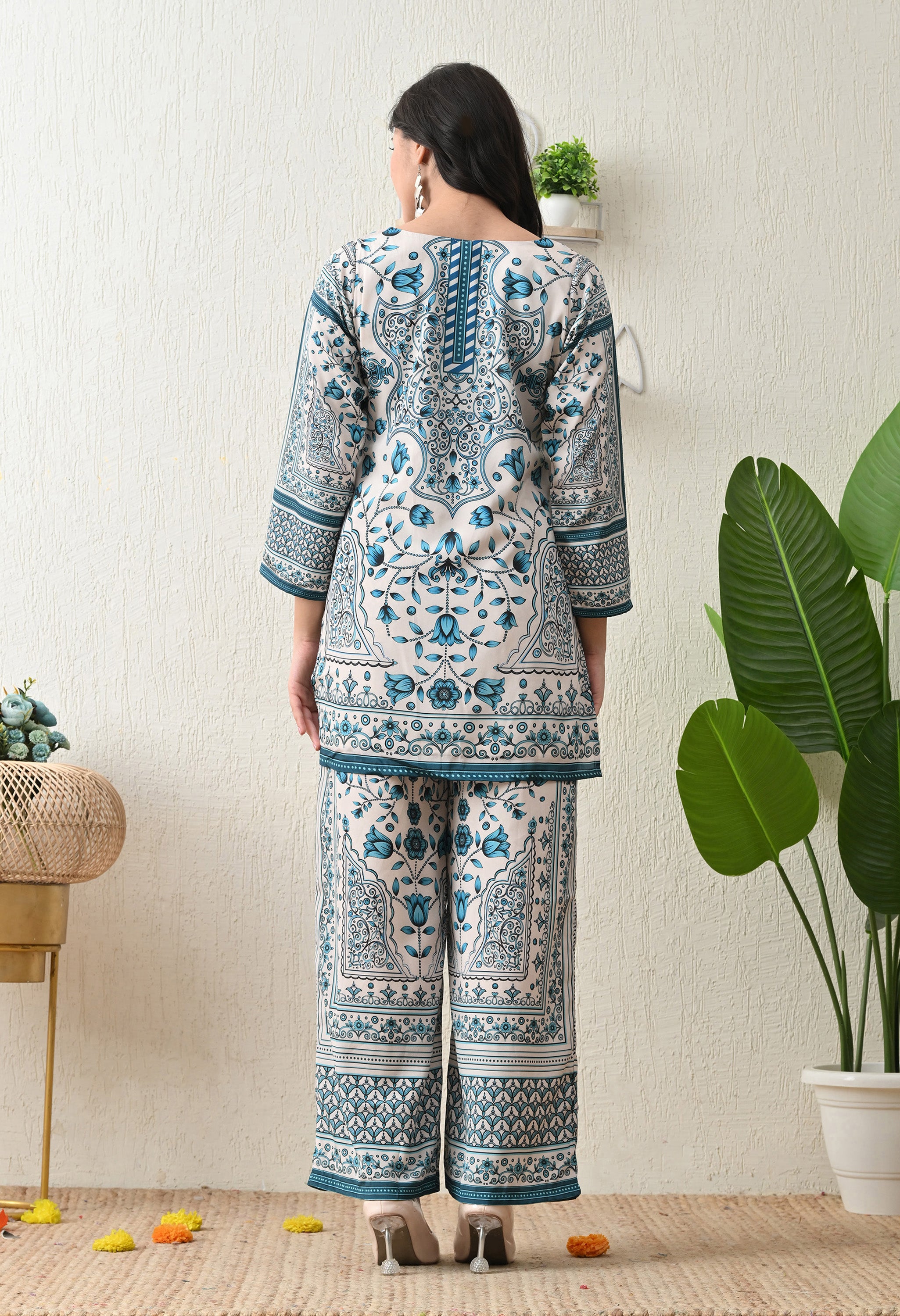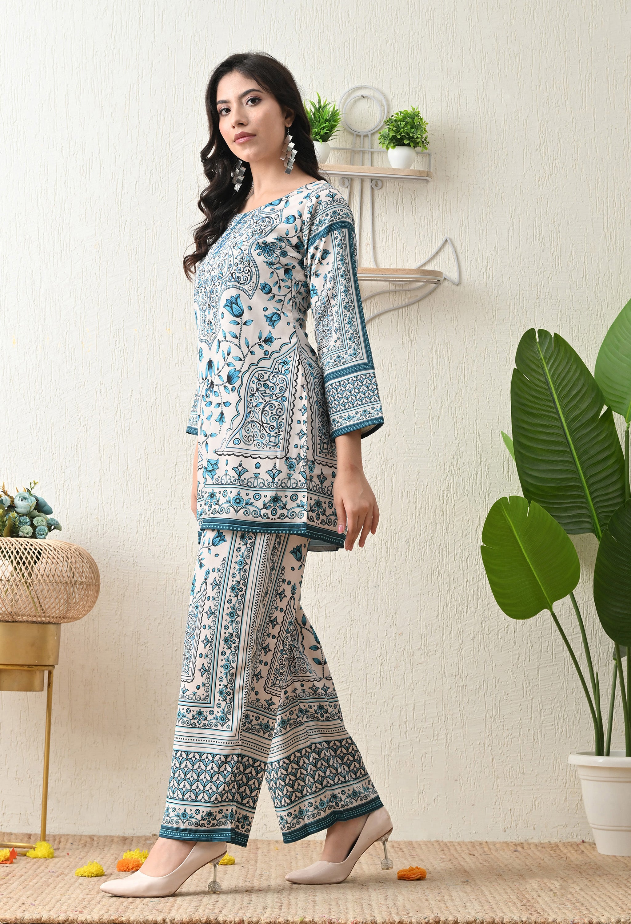 Step into effortless elegance with the Tribal coord-set. This beautifully crafted ensemble features a straight-cut kurta adorned with intricate floral and paisley motifs in soothing teal and ivory tones,Paired with matching wide-legged palazzo pants that echo the kurta’s charming print, this set creates a coordinated, contemporary look The lightweight fabric drapes gracefully, offering both comfort and style for casual gatherings or festive occasions.