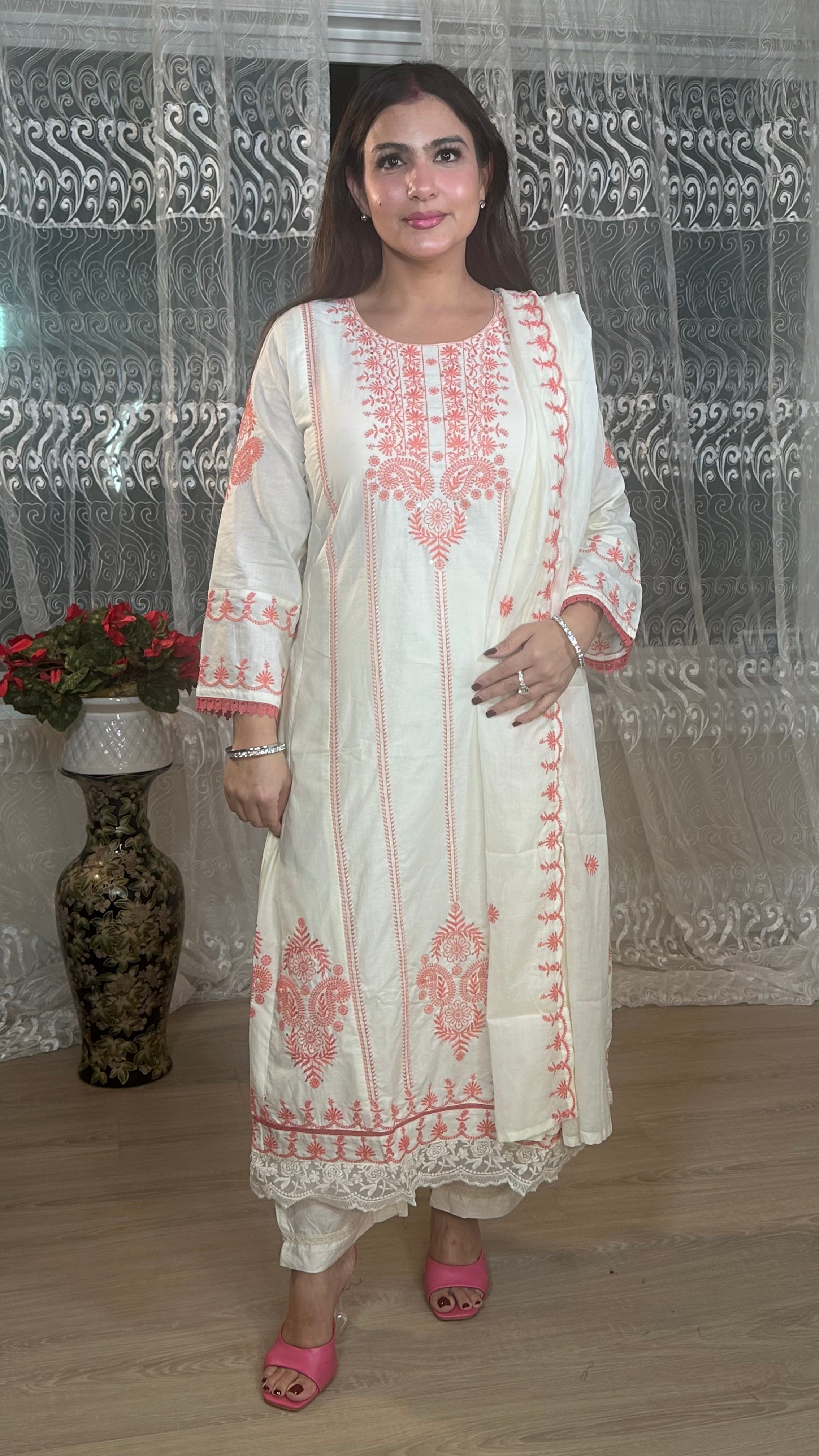 Step into timeless elegance with this ivory white suit set adorned with delicate peach thread embroidery. The straight kurta features intricate along with vertical embroidered stripes, giving it a graceful and elongated look.