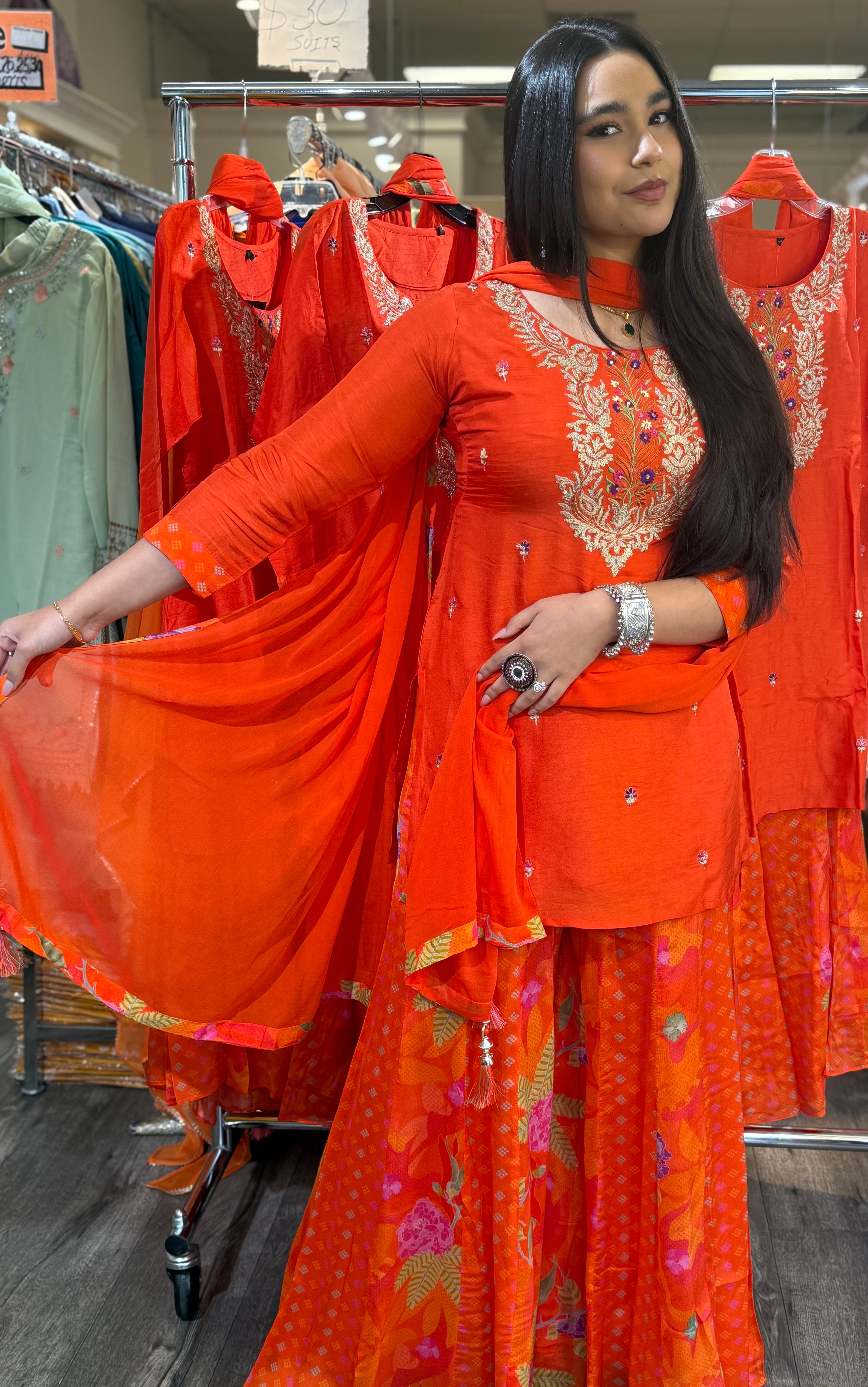 Turn heads at every festive occasion with this stunning Red Embroidered Sharara Suit Set — a perfect blend of traditional charm and contemporary grace. Crafted from lightweight georgette fabric, this ensemble features a short A-line kurta with intricate thread and zari embroidery along the neckline and yoke, beautifully accented with mirror embellishments.