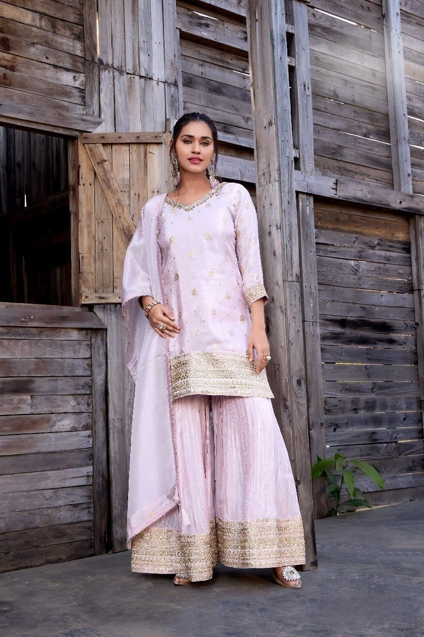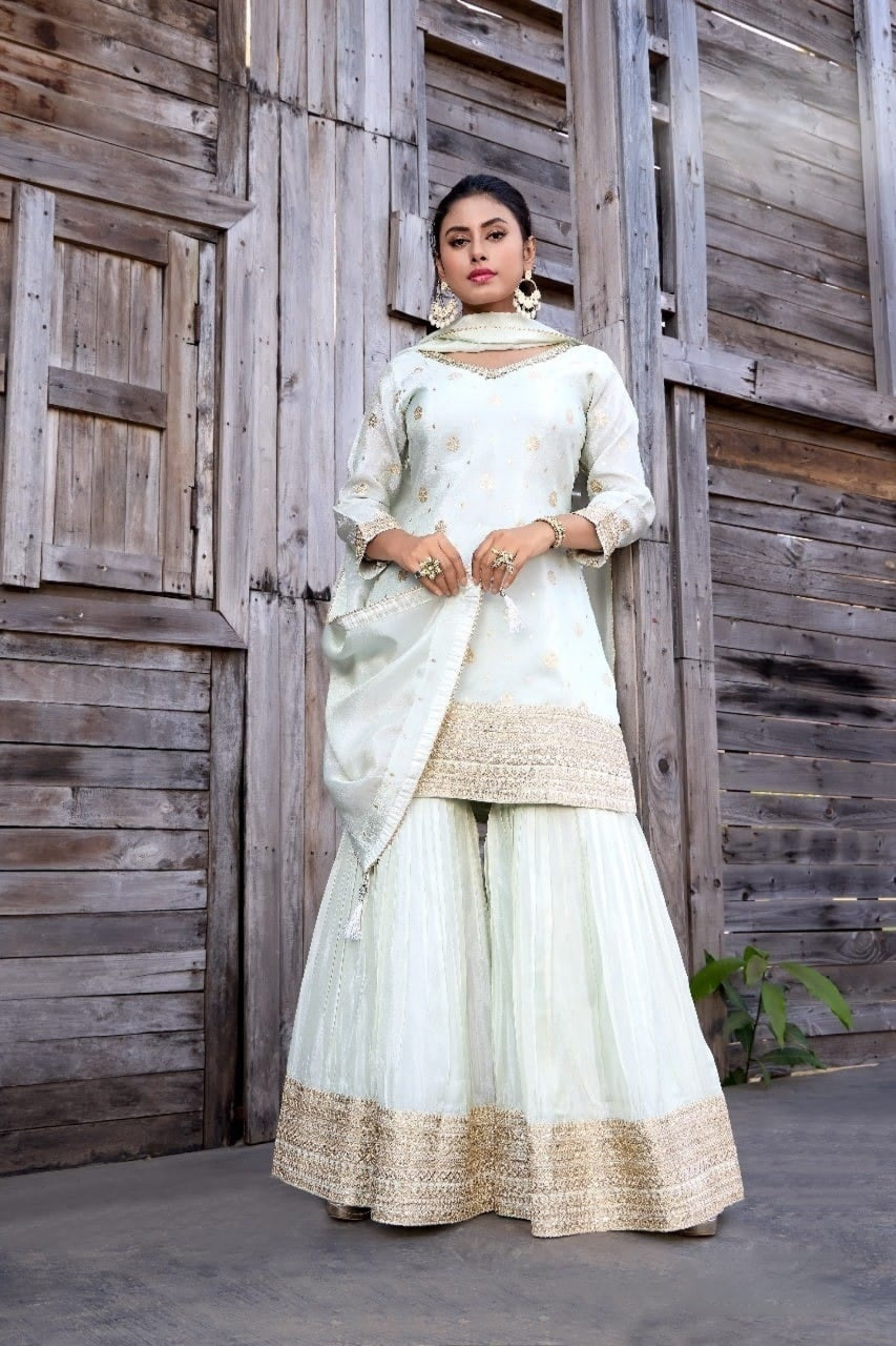 Radiate festive charm with this Beautiful Sharara crafted with rich embellishments and graceful detailing. The combination of classic kurta and flowy sharara pants makes it perfect for weddings, parties, and traditional gatherings