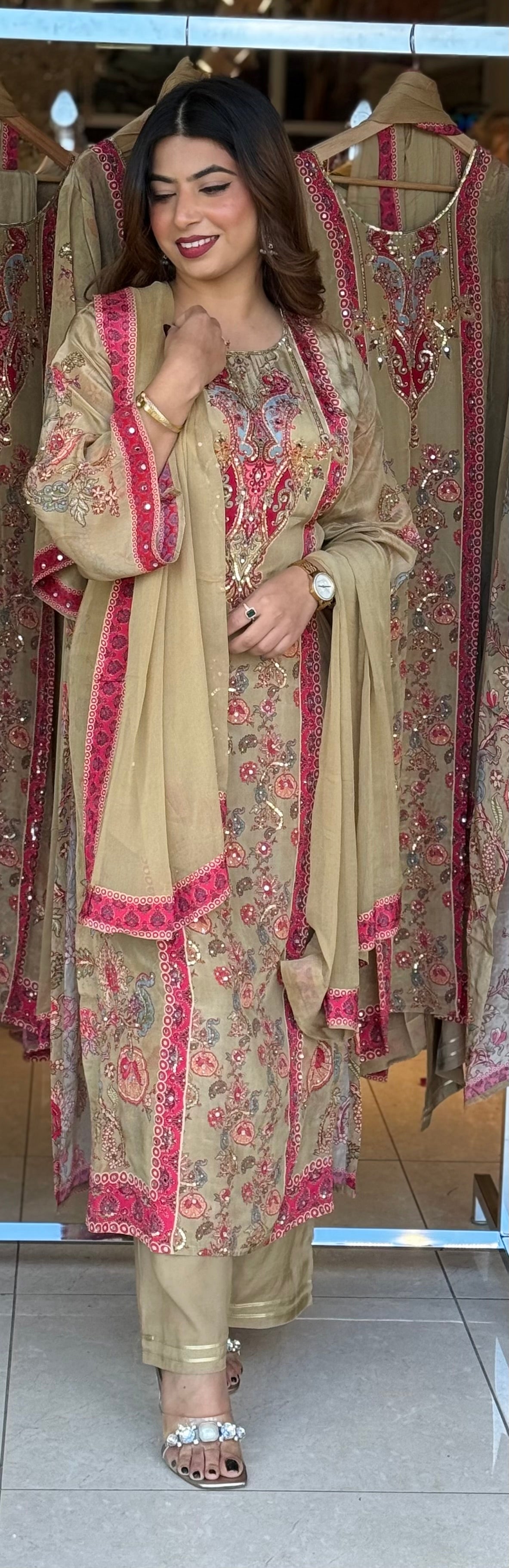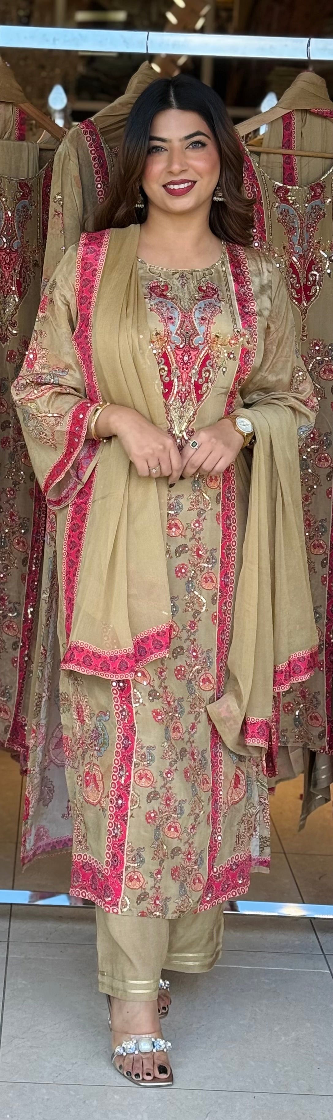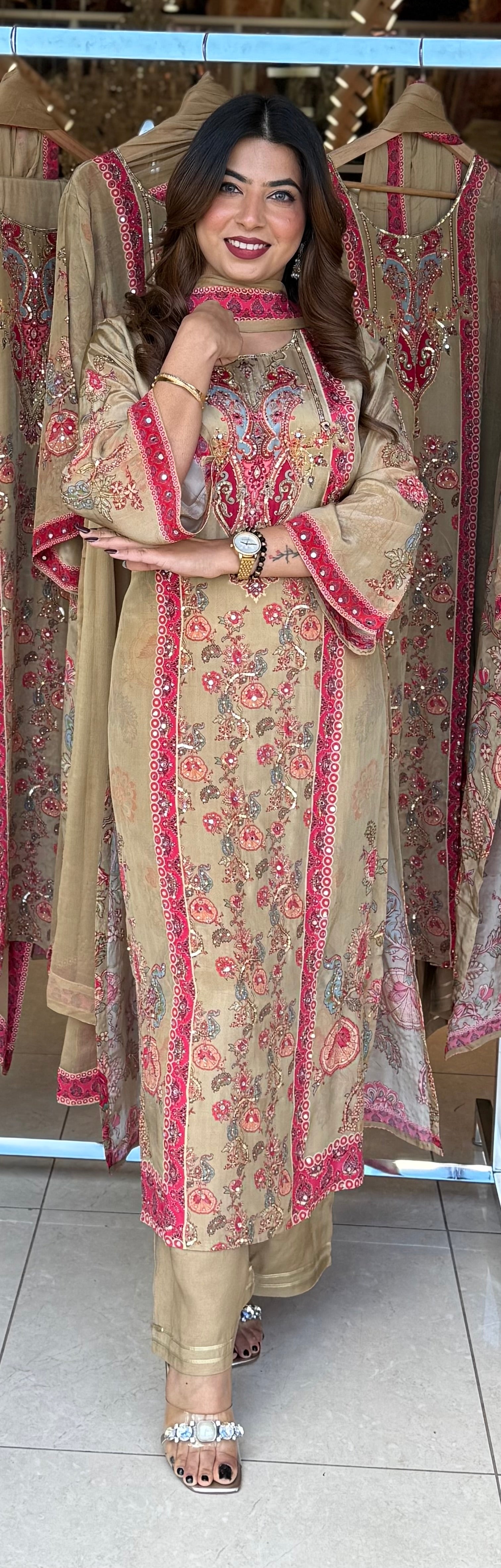 Step into timeless elegance with this beautifully embroidered 3-piece suit, crafted with intricate floral motifs and vibrant detailing. The soft beige base paired with bright pink and gold embroidery creates the perfect balance of sophistication and festive charm. Ideal for formal gatherings, festive occasions, and traditional celebrations.
