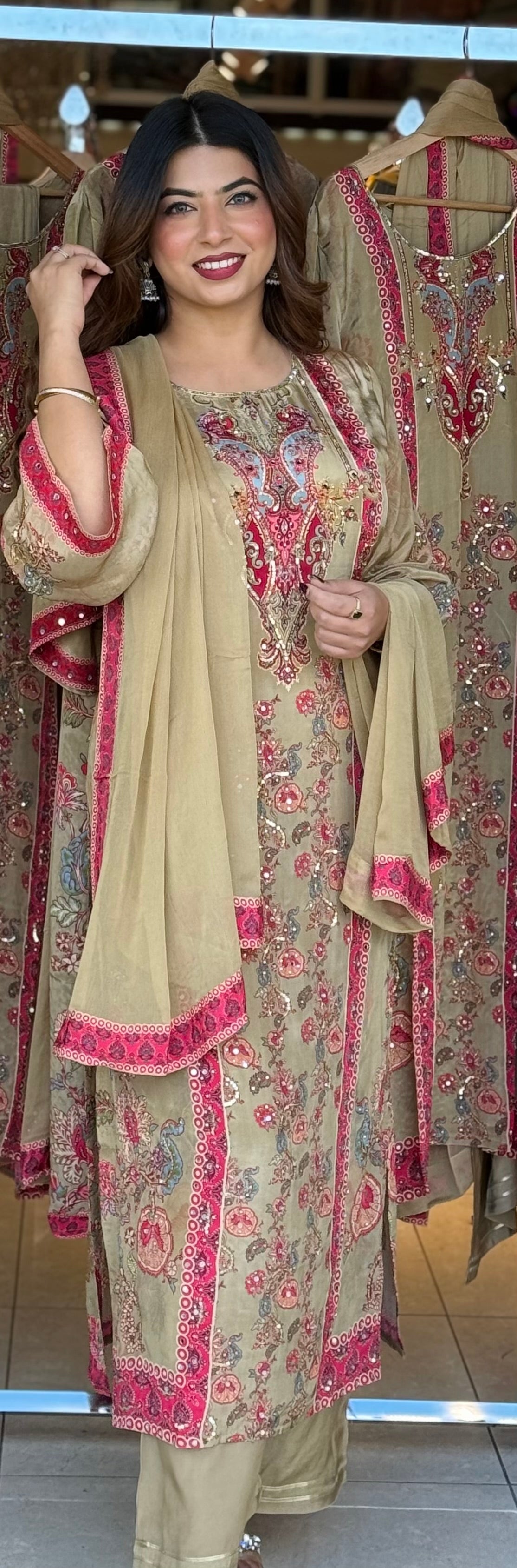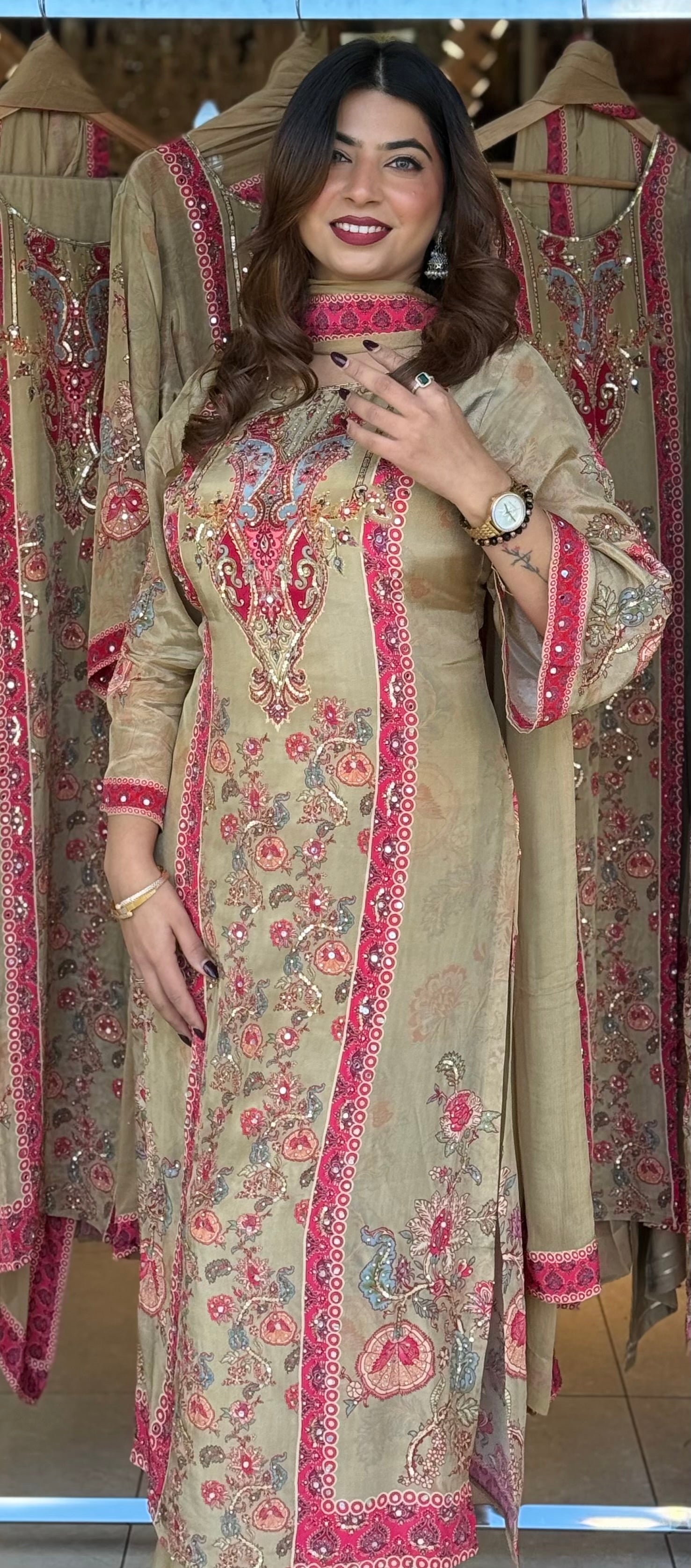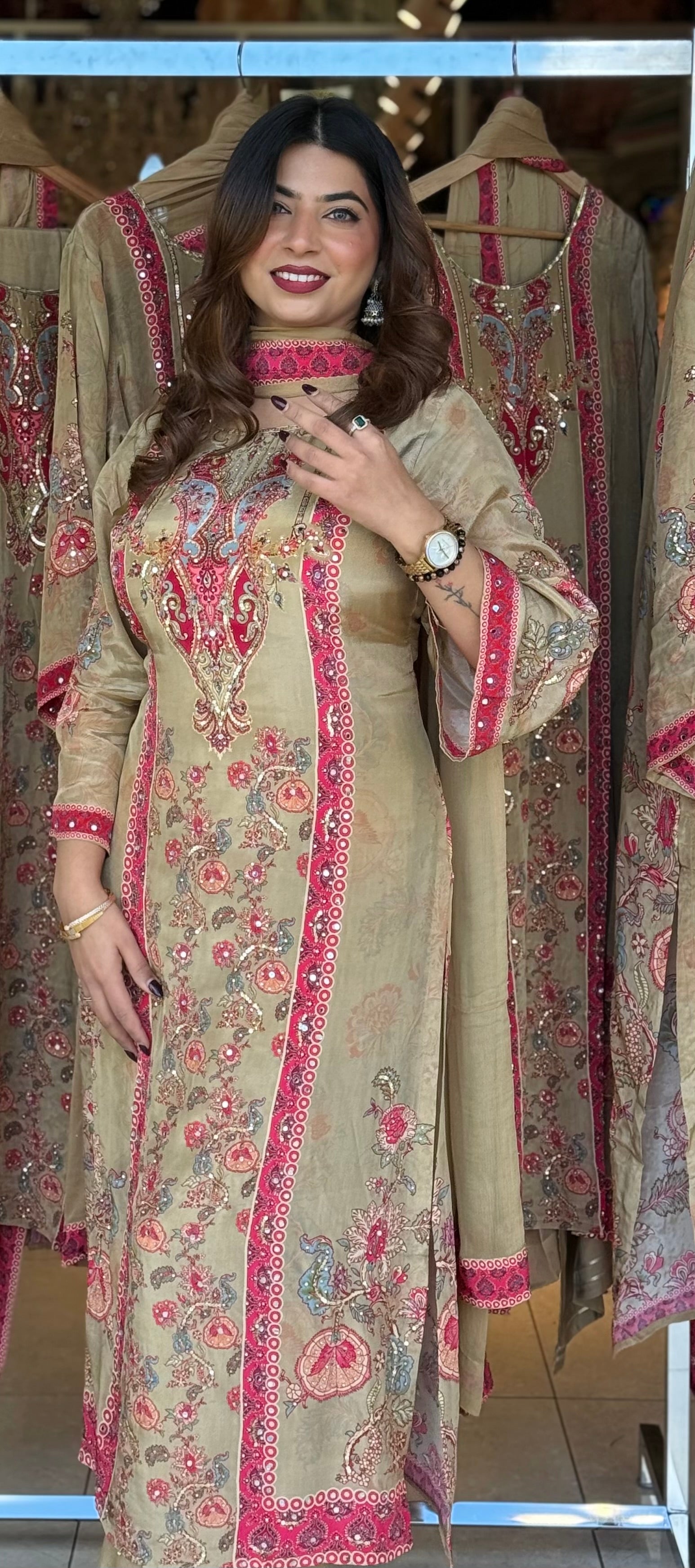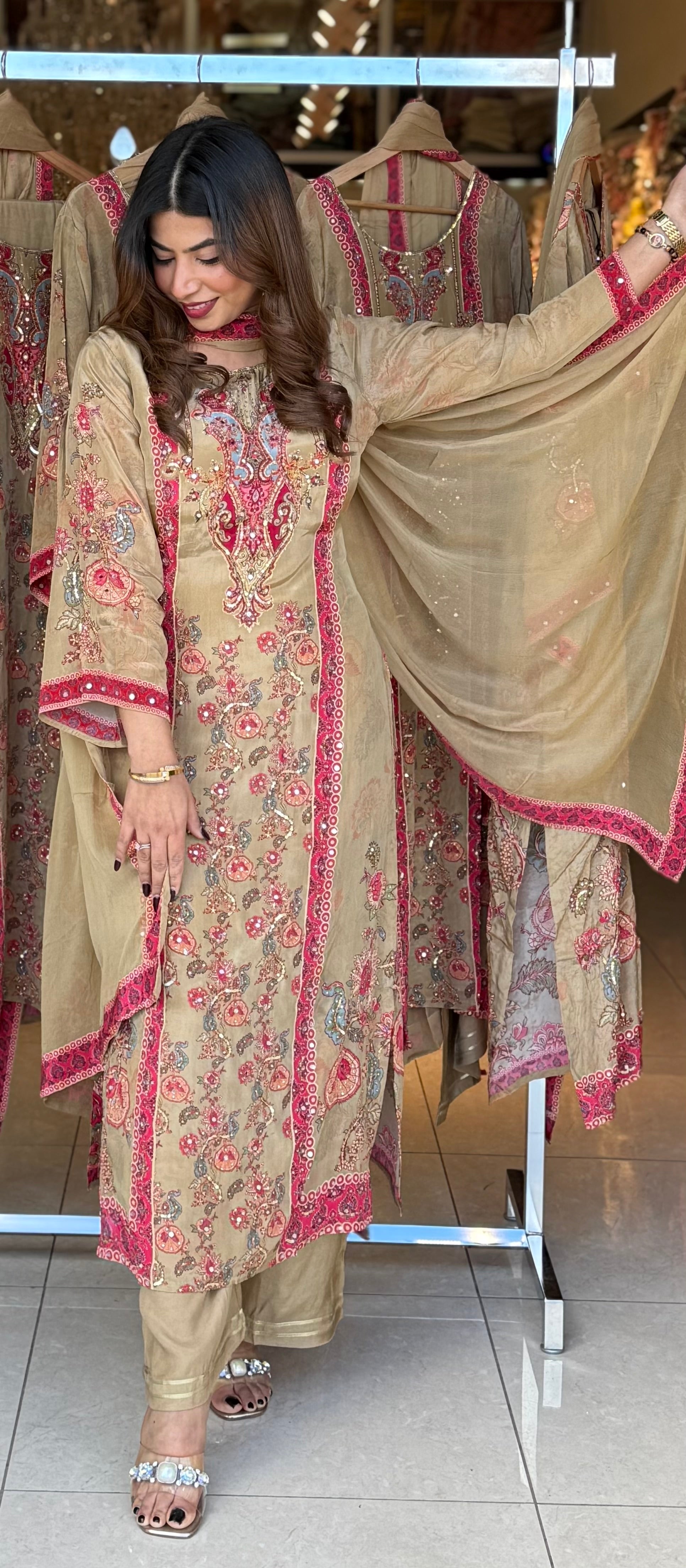 Step into timeless elegance with this beautifully embroidered 3-piece suit, crafted with intricate floral motifs and vibrant detailing. The soft beige base paired with bright pink and gold embroidery creates the perfect balance of sophistication and festive charm. Ideal for formal gatherings, festive occasions, and traditional celebrations.