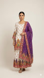 This elegant Anarkali suit set beautifully blends traditional artistry with modern sophistication. The ivory base is adorned with intricate floral embroidery in vibrant hues of orange, green, and gold, creating a timeless festive appeal. The ensemble is paired with a regal purple dupatta that features delicate embroidered motifs and a rich, ornate border, adding contrast and grandeur to the look. Perfect for weddings, festive celebrations, and cultural events.