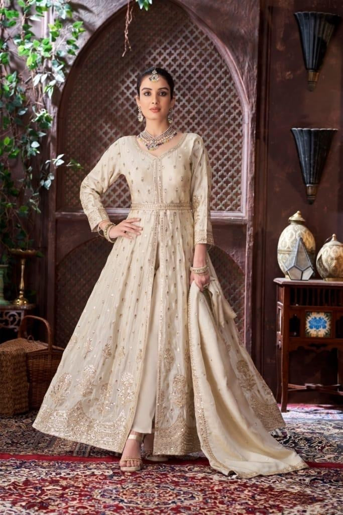 Step into timeless elegance with this exquisite cream Anarkali suit crafted to perfection.Designed with intricate zari and resham embroidery, this outfit blends royal charm with contemporary finesse.Perfect for weddings, receptions, festive gatherings, and grand occasions.