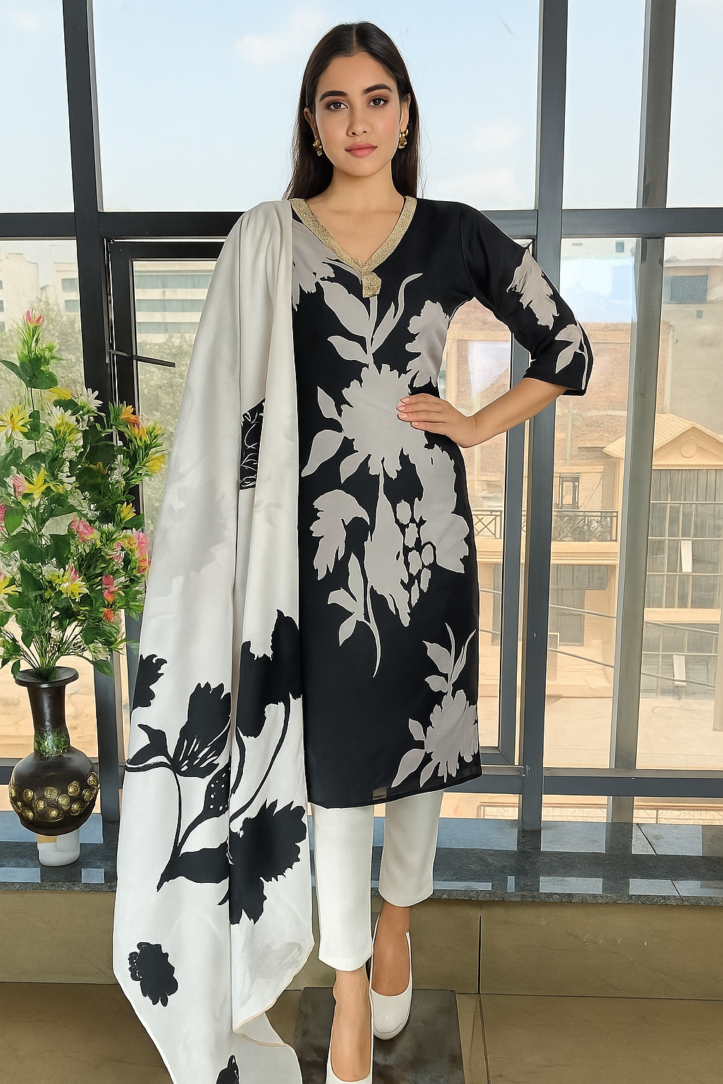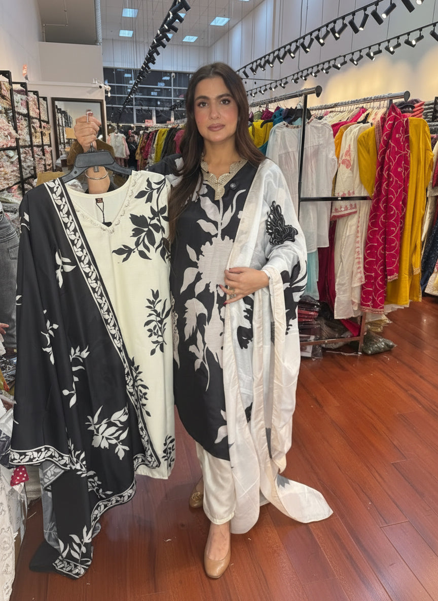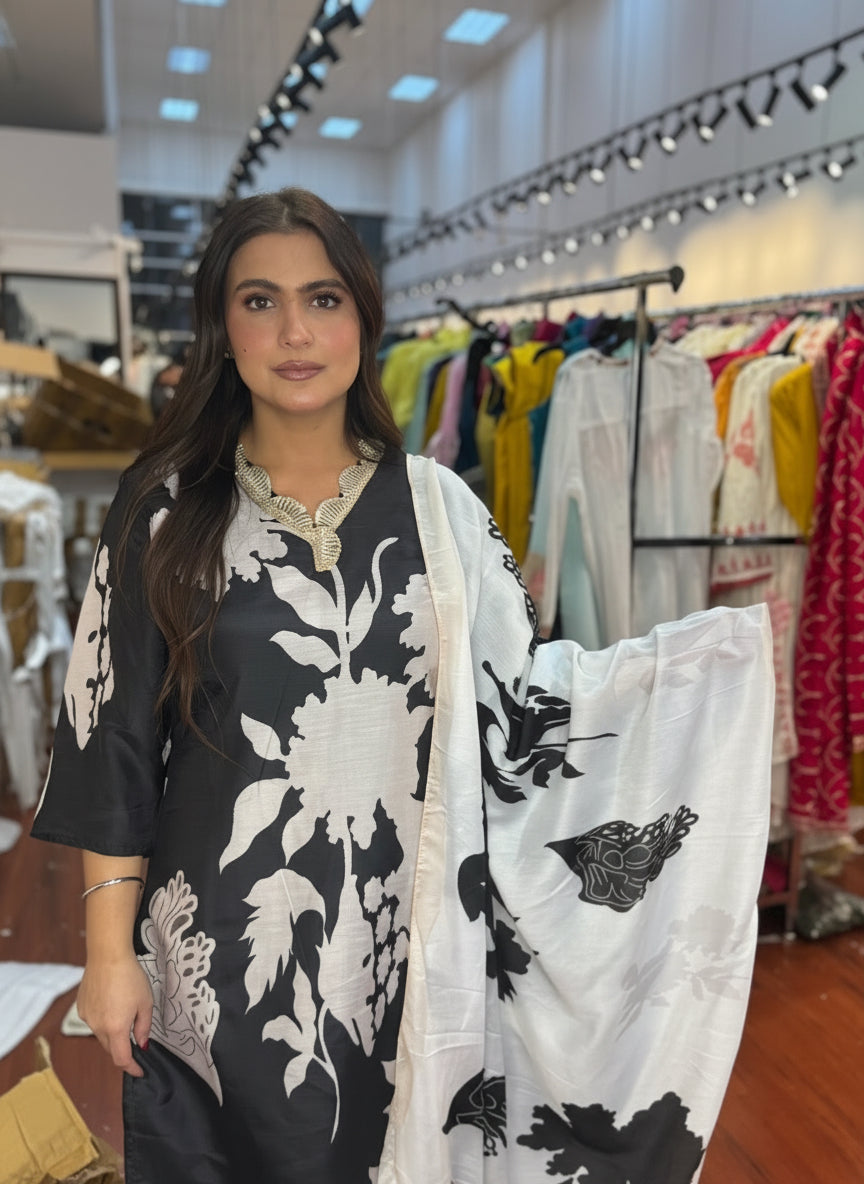 Make a timeless style statement with this beautifully designed black and white floral printed straight kurta set. Crafted in a soft and breathable crepe/poly blend fabric, this outfit offers all-day comfort with a refined, elegant fall.