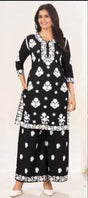 PRODUCT DETAILS :Turn heads this festive season with our stunning black embroidered kurta set, a blend of grace and comfort. this outfit features elegant white floral embroidery and prints that add a royal charm to your ethnic look