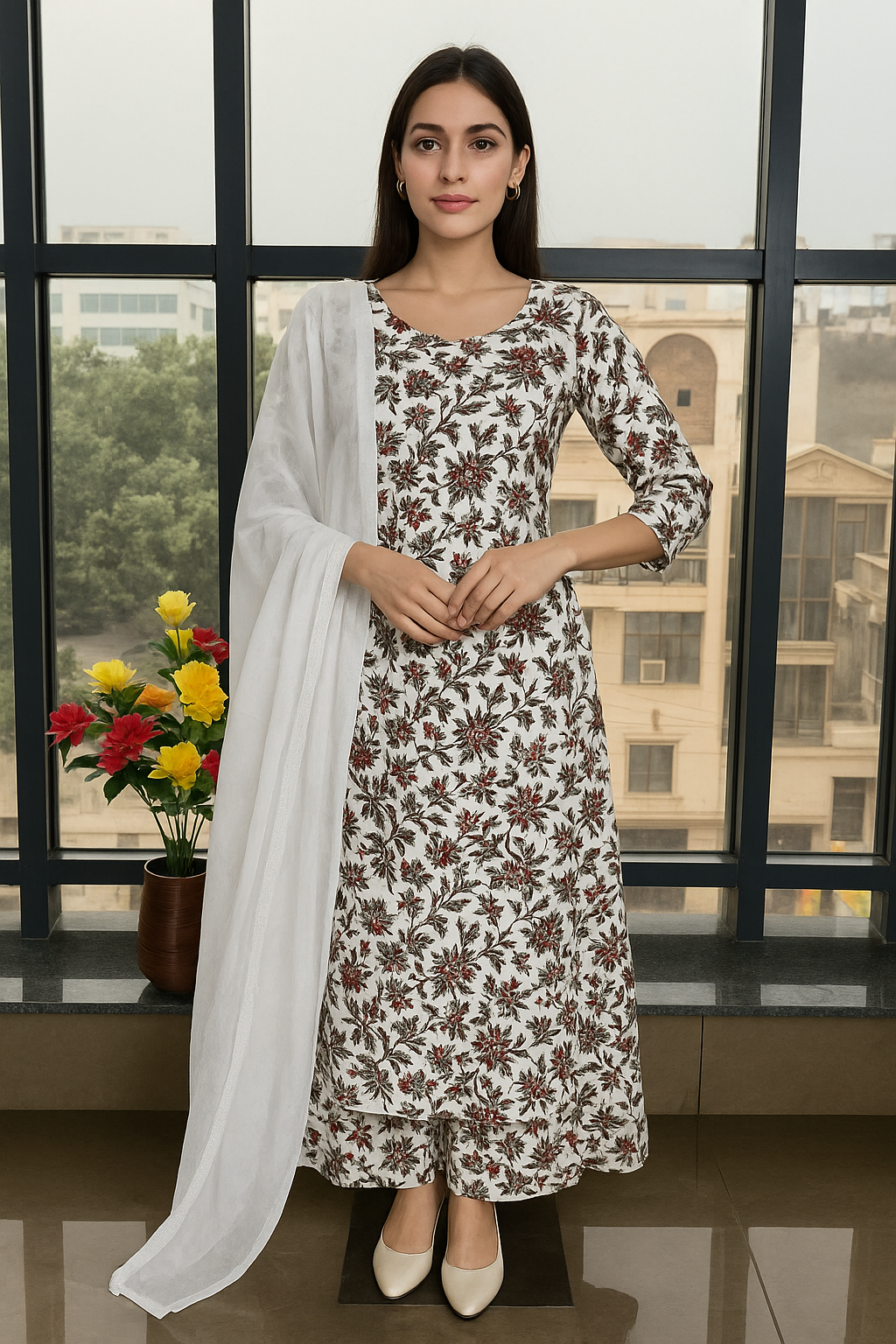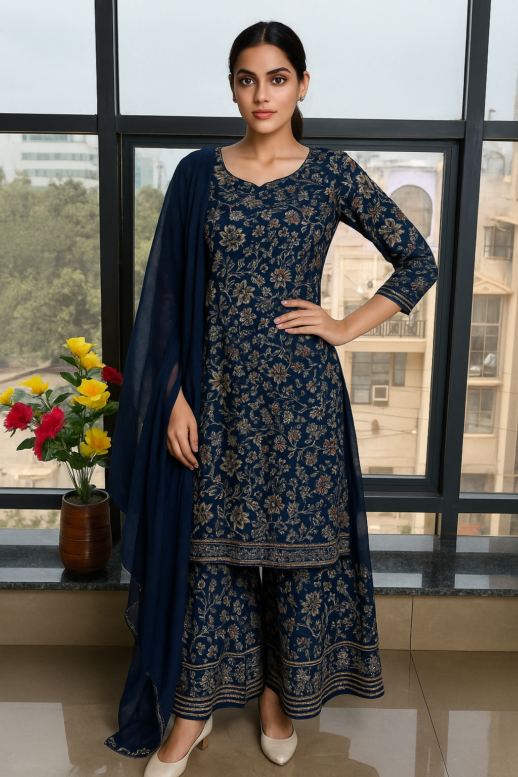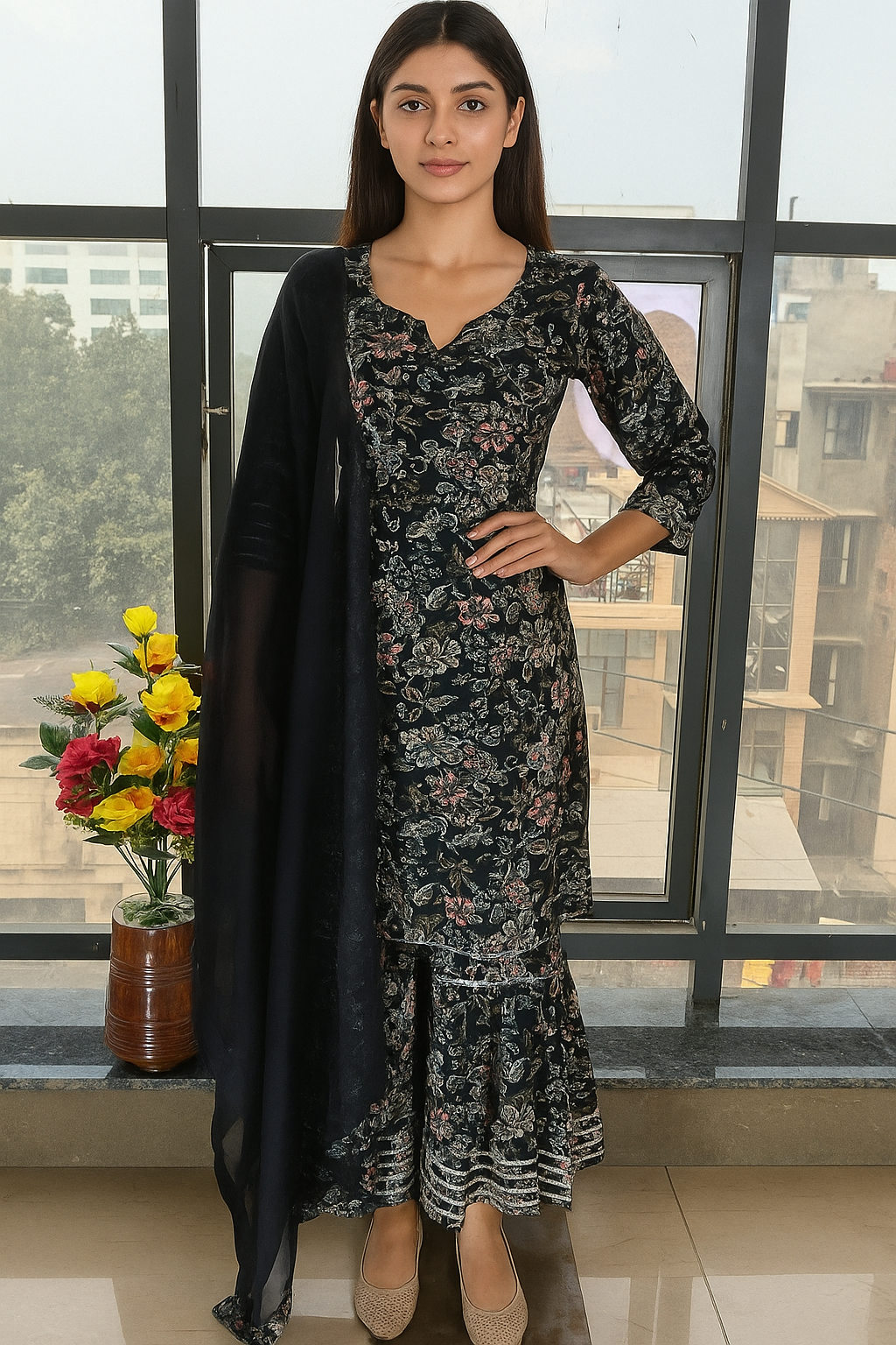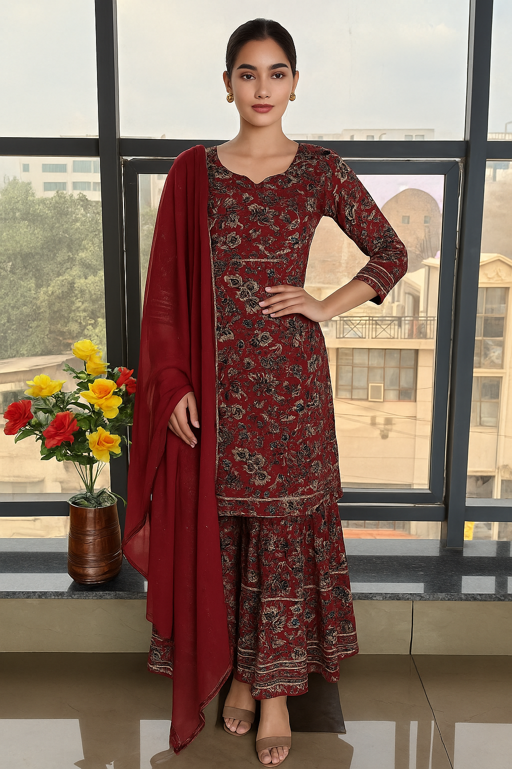 PRODUCT DETAILS : Step out in style with this chic printed kurta set, featuring a matching tiered sharara and dupatta. The rich maroon hue combined with an intricate floral print creates a sophisticated and festive look. Subtle metallic border accents add a touch of glamour, making it perfect for celebrations and special occasions.
