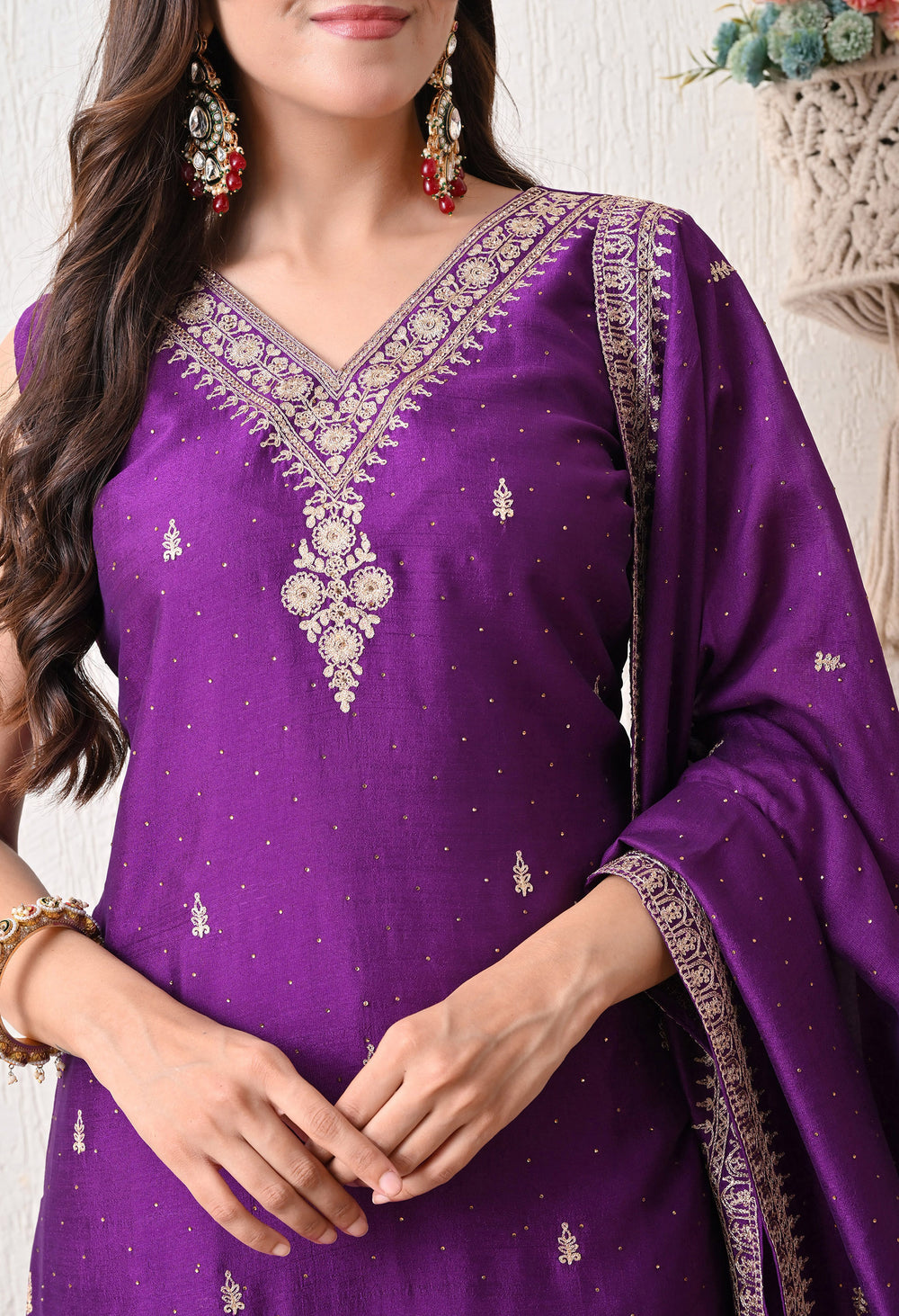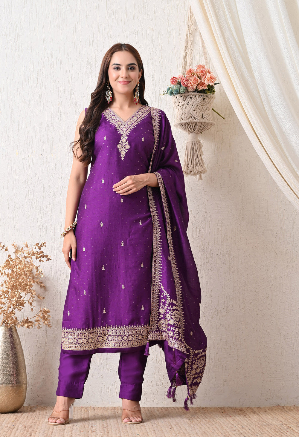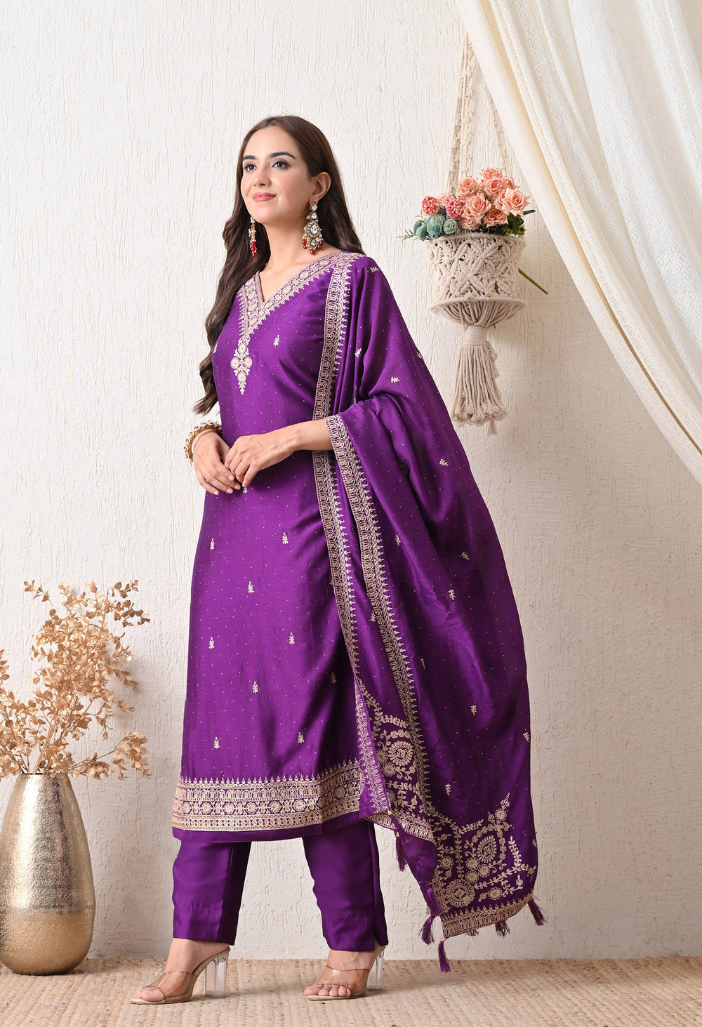 step into timeless elegance with the Rang Mehal – a regal purple ensemble adorned with delicate golden embroidery. The V-neck kurta features intricate handwork on the neckline and hem, paired with a beautifully bordered dupatta and straight pants. Perfect for festive occasions or evening soirees, this suit blends tradition with sophistication in every stitch.