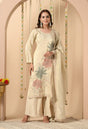 Grace meets simplicity in this elegant cream silk suit set. The ensemble features a beautifully embroidered straight-cut kurta with floral motifs, paired with comfortable wide palazzo pants and a matching dupatta. A timeless piece perfect for festive celebrations, formal events, or graceful day wear.