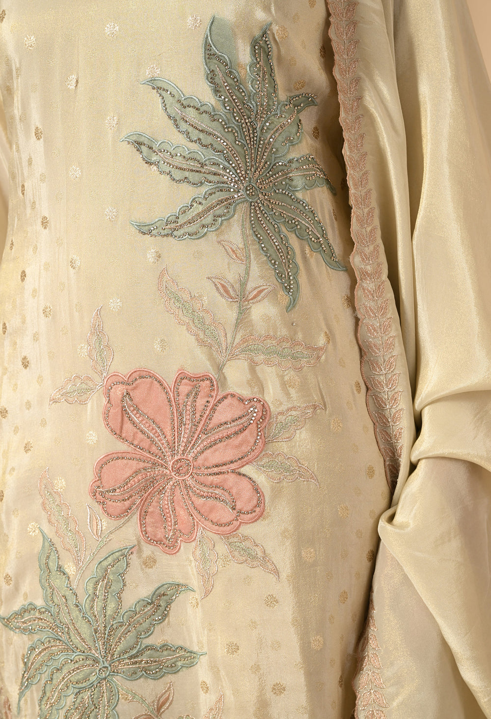 Silk blend with intricate thread and sequin embroidery