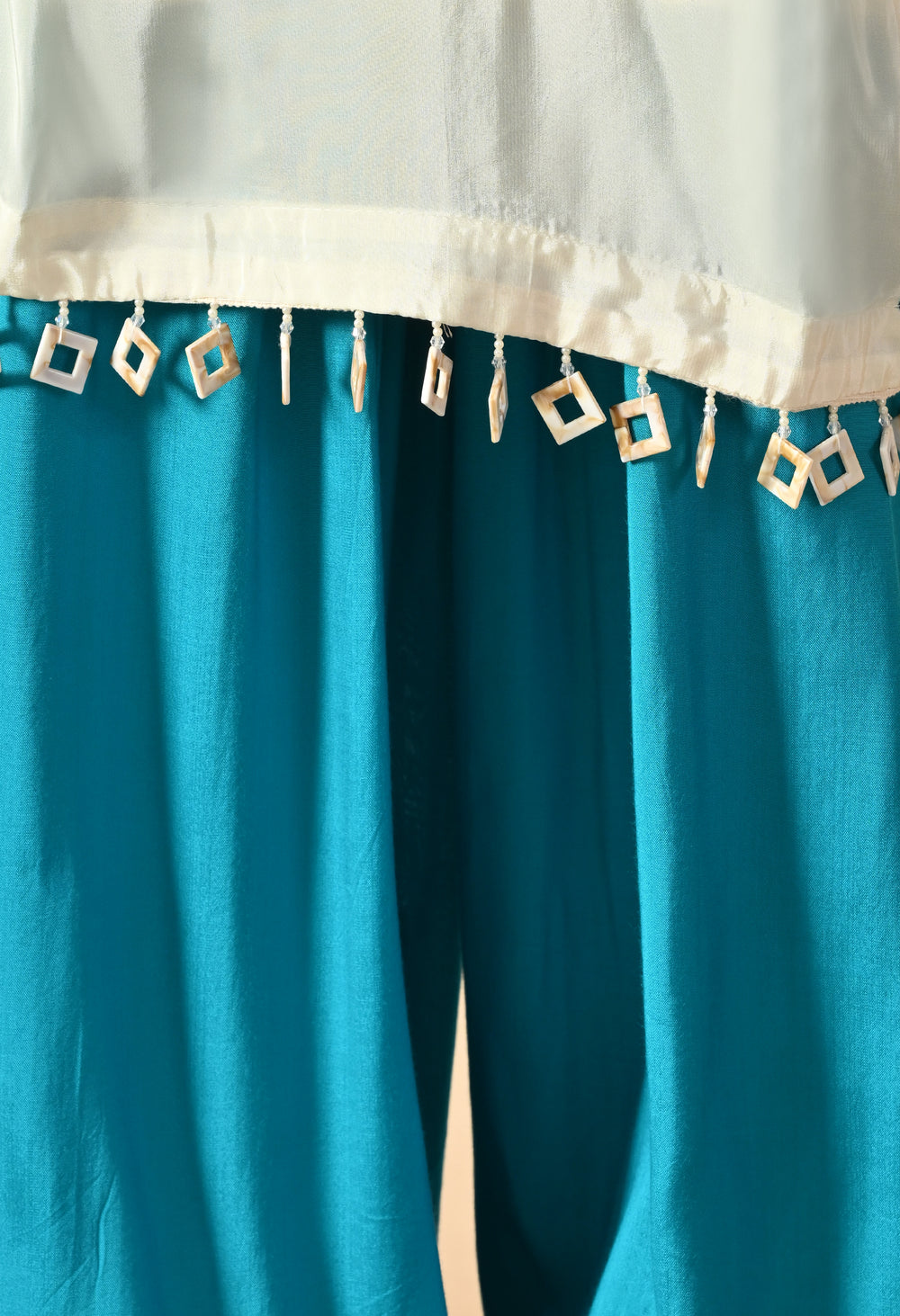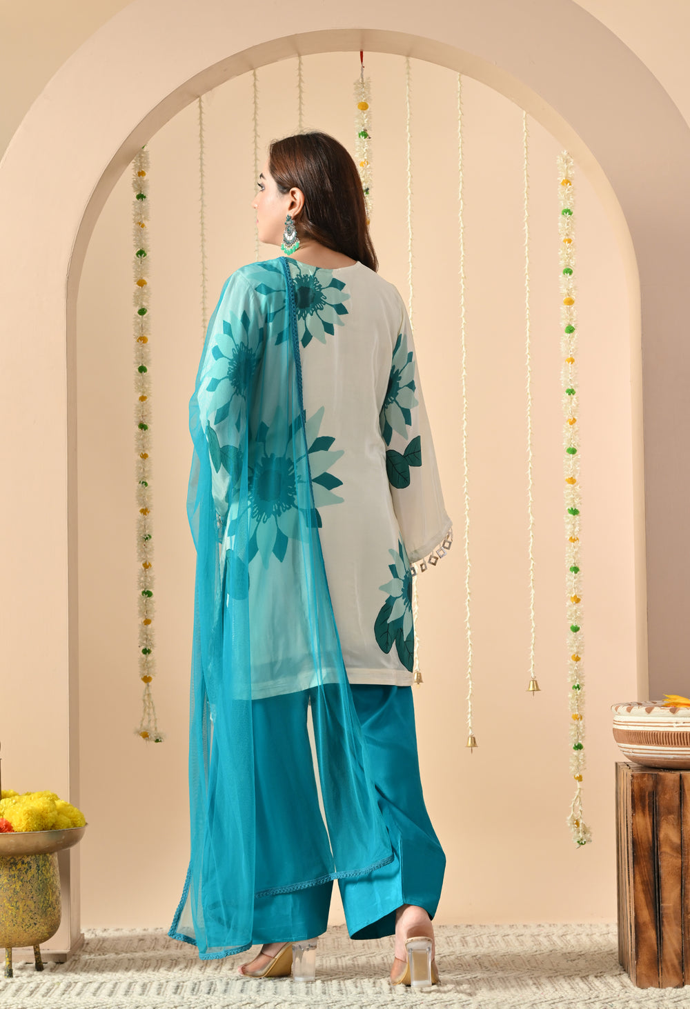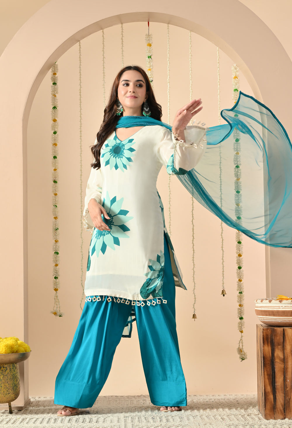 A refreshing ethnic ensemble, designed with floral prints and a breezy silhouette. Perfect for casual festive gatherings, daytime events, or summer wear, this outfit combines comfort with chic ethnic charm.