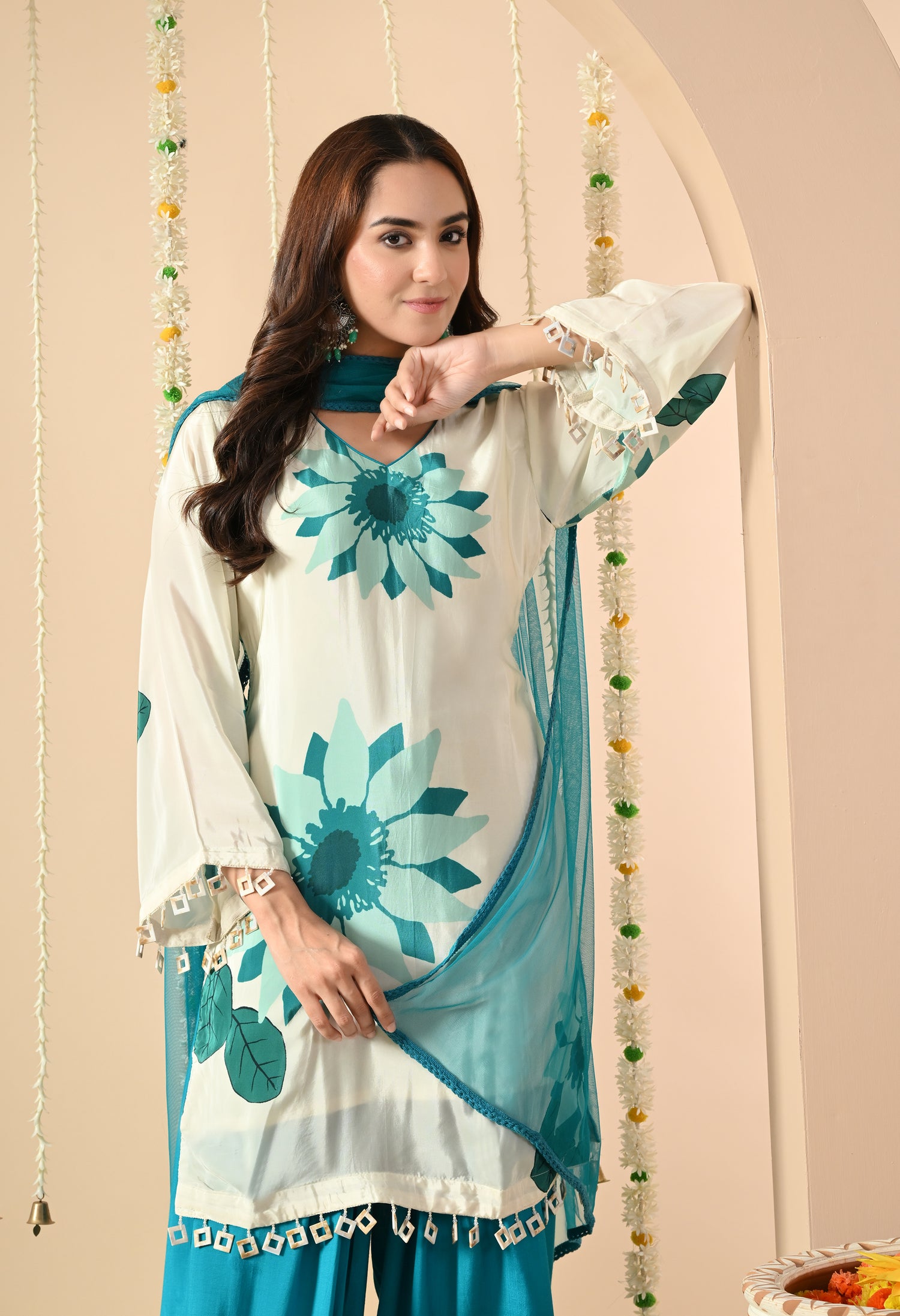 A refreshing ethnic ensemble, designed with floral prints and a breezy silhouette. Perfect for casual festive gatherings, daytime events, or summer wear, this outfit combines comfort with chic ethnic charm.