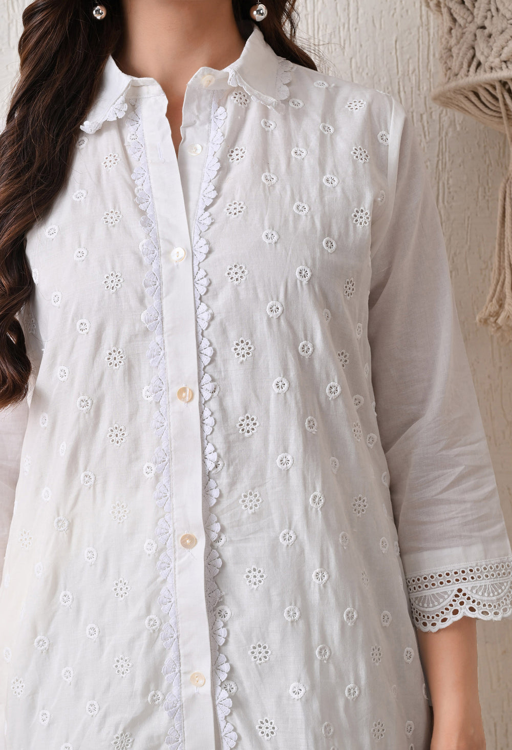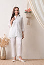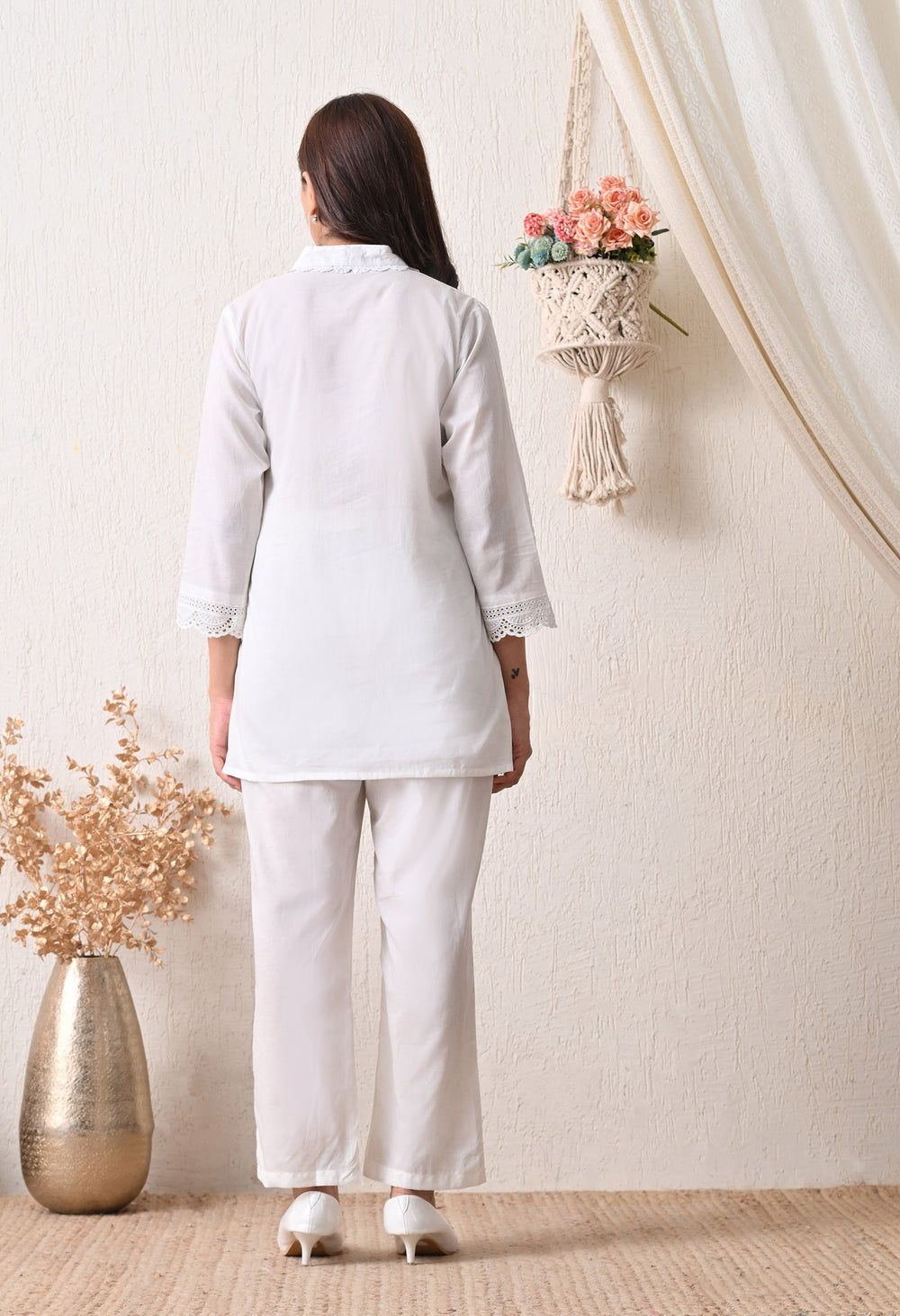 Radiate effortless charm in our mirage coord set, an all-white ensemble that embodies simplicity and sophistication. The short kurta features delicate eyelet embroidery with scalloped edges, button-down front, and soft lace detailing on the sleeves. Paired with straight-fit trousers finished with matching lace at the hem, this set is your go-to pick for summer brunches, casual office looks, or serene festive mornings.